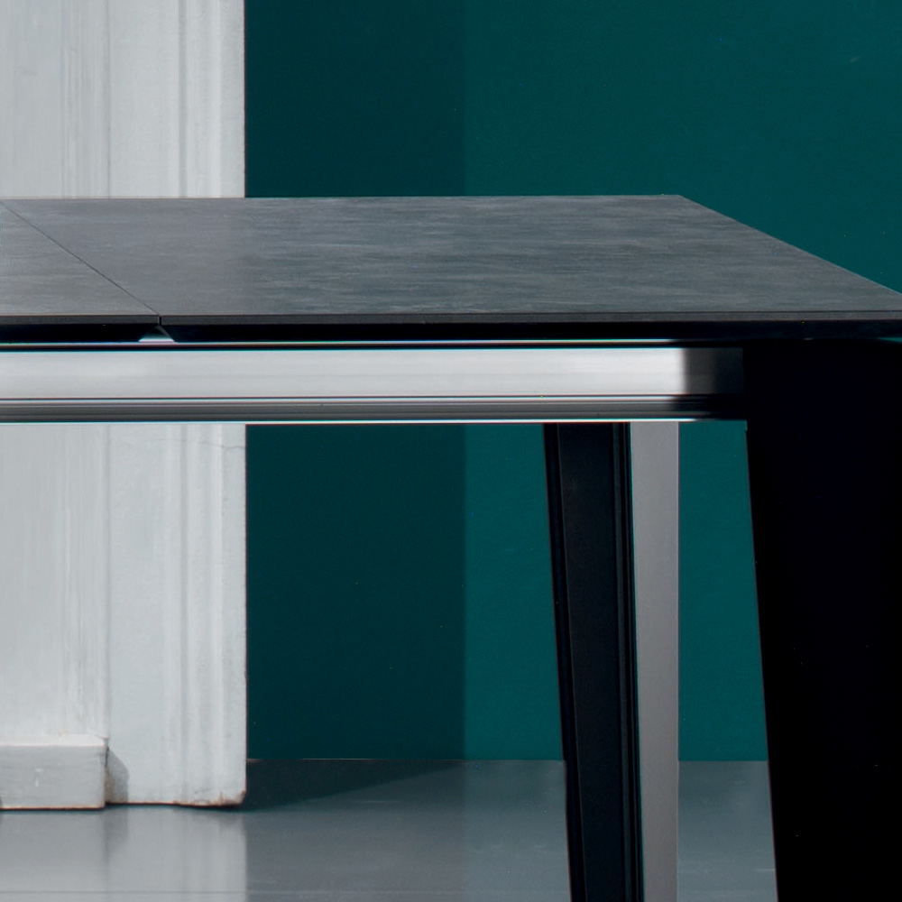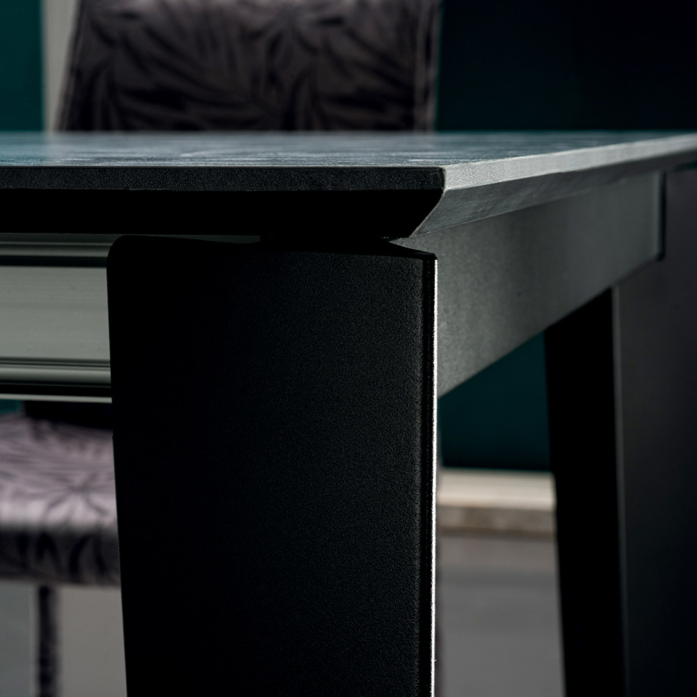 Stół do jadalni z rozkładanym blatem z laminatu HPL imitującego kamień, z profilem krawędziowym ściętym pod kątem 45° i stalową podstawą malowaną na czarno . Akcesoria meblowe wykonane ręcznie we Włoszech z wysokiej jakości materiałów i w 100% wyprodukowane we Włoszech, co zapewnia idealne połączenie elegancji i funkcjonalności . Jego specyfikę stanowi praktyczny rozkładany blat , który może osiągnąć długość 310 cm, dzięki czemu może pomieścić do 16 osób na wspaniałych lunchach i kolacjach w towarzystwie. Jego solidny i elegancki design podkreśla i wzbogaca blat hpl, laminat wysokociśnieniowy niezwykle odporny na czynniki chemiczne, ścieranie i zarysowania, co pozwala zapewnić solidną powierzchnię nośną o doskonałej trwałości w czasie .