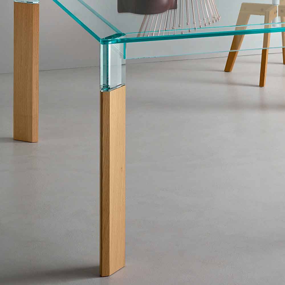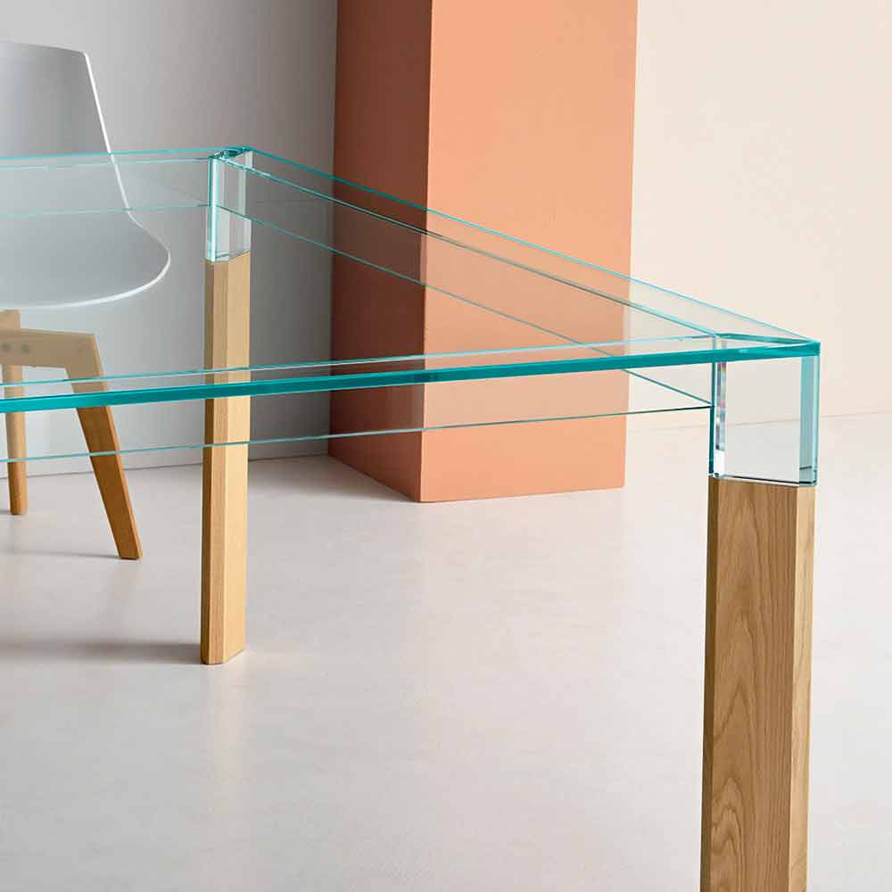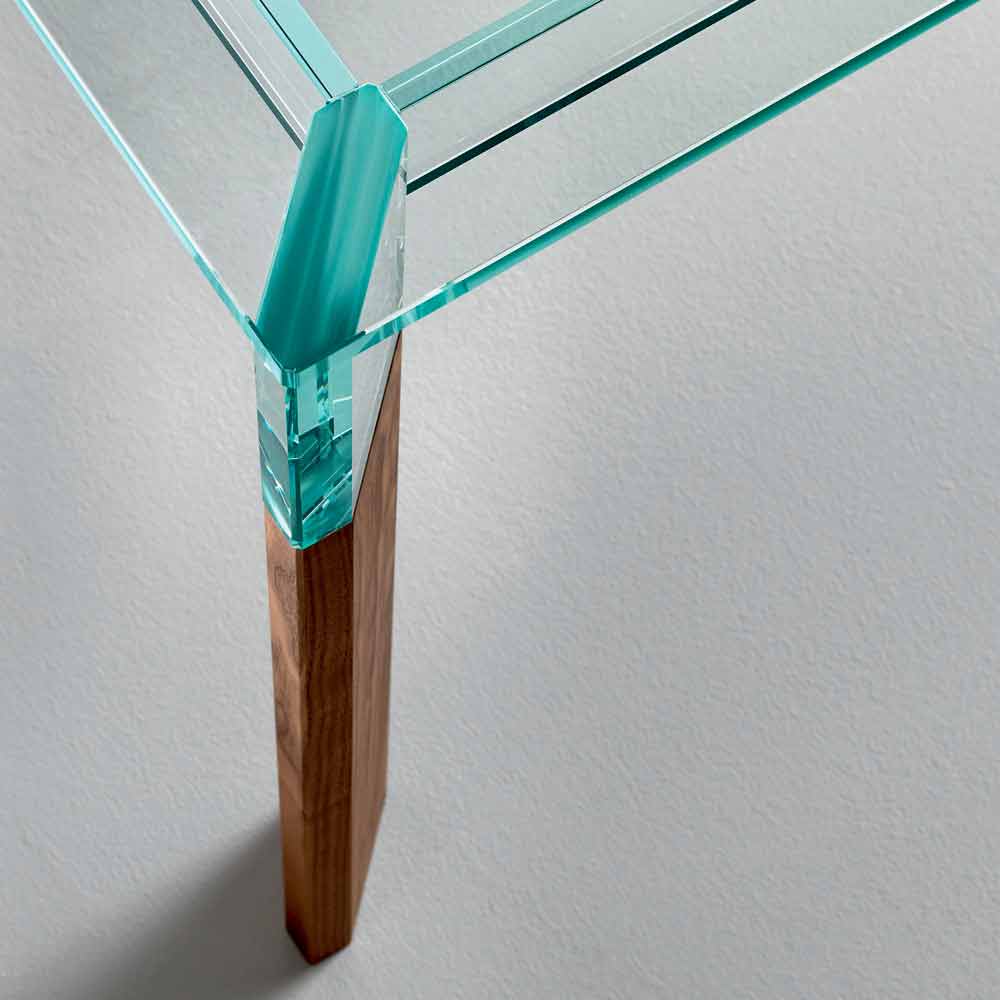 Luksusowy stół jadalny z wyjątkowo przezroczystym szklanym blatem i podstawą z litego drewna, wykonany we Włoszech.