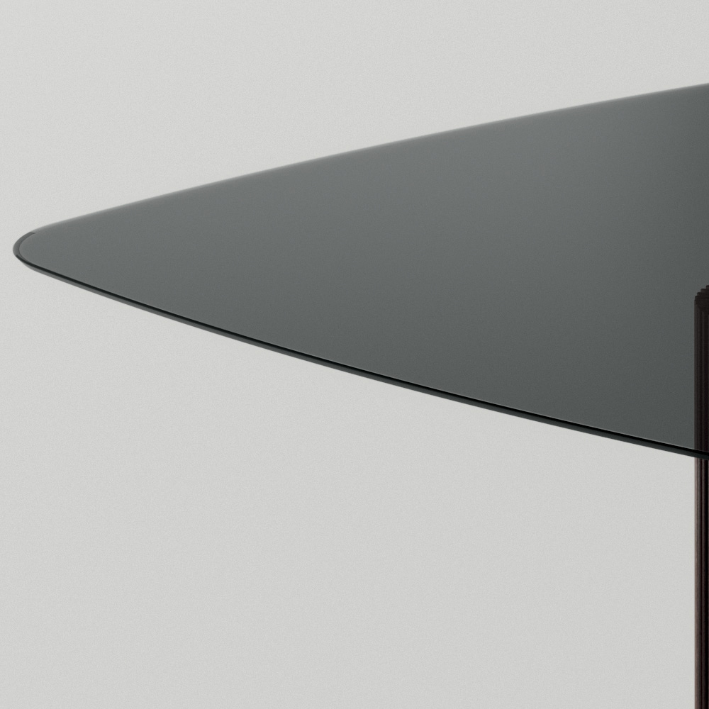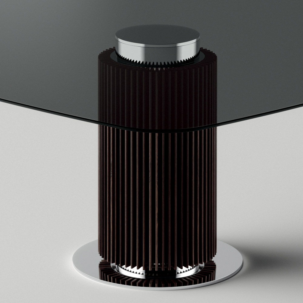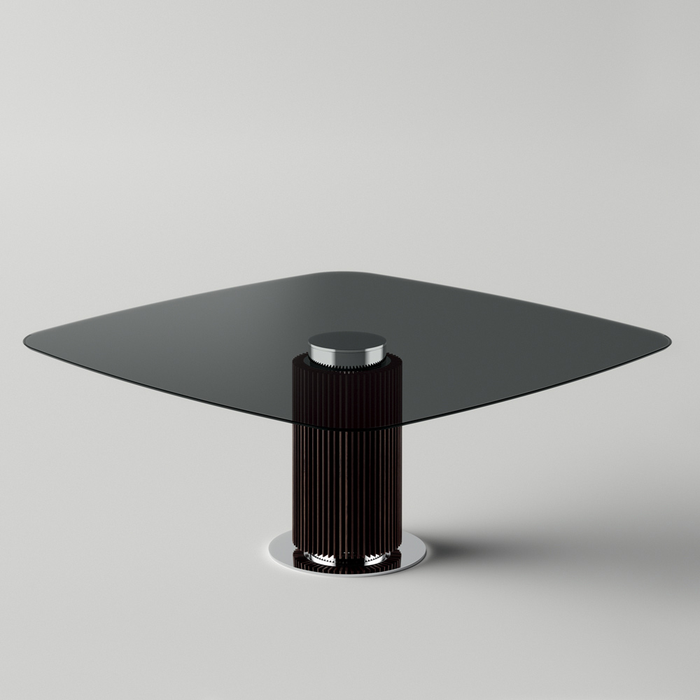 Kwadratowy stół z blatem z dymionego szkła i drewnianą podstawą Made in Italy.
