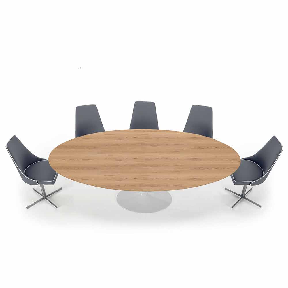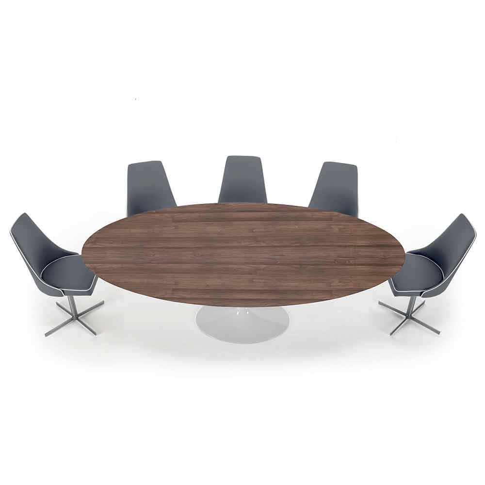 odlewu aluminiowego w kolorze białym, błyszczącym, wyprodukowanym we Włoszech. Szczególny owalny kształt blatu podkreśla jego wyjątkowość wraz z wyjątkowym kształtem podstawy, tworząc w ten sposób stół o