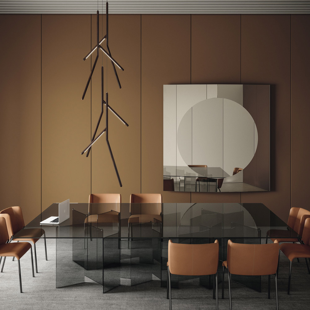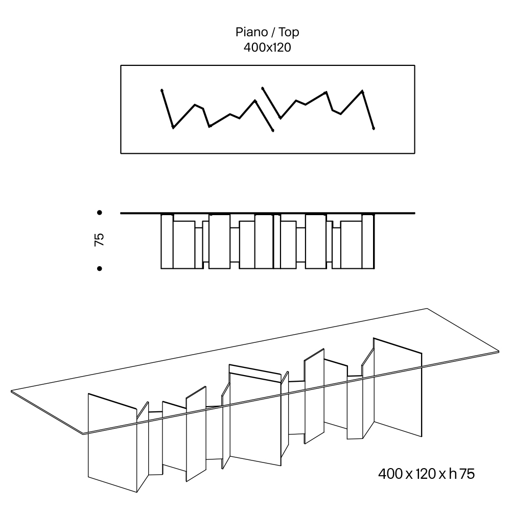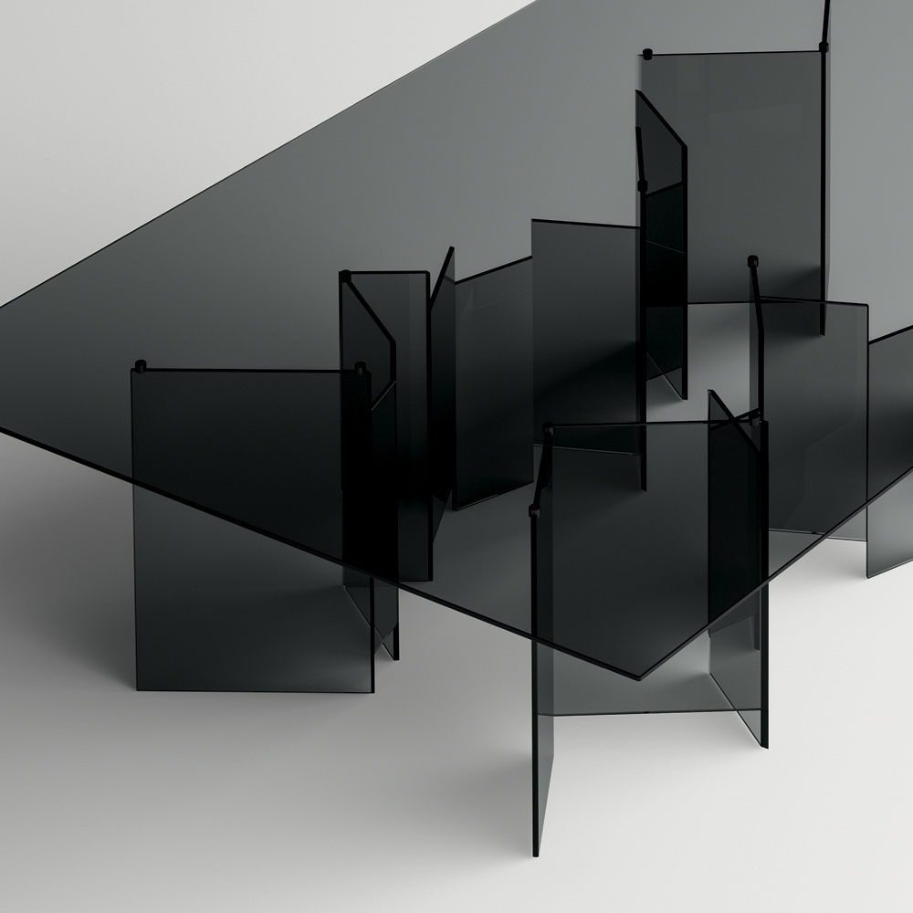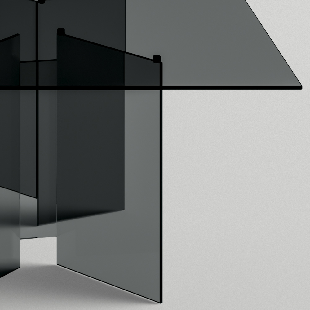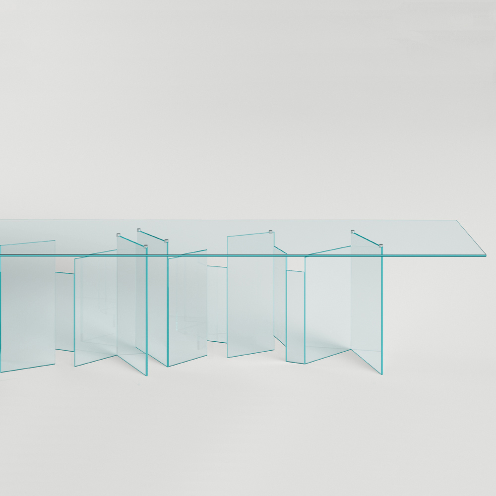 Stół do jadalni składający się z podstawy o geometrycznych kształtach i prostokątnego blatu, oba wykonane ze szkła . Rozwiązanie meblowe, które wywodzi się z procesu produkcji Made in Italy poprzez fachową obróbkę szkła przez wykwalifikowanych rzemieślników , którzy pozwalają ożywić idealne połączenie jakości , wzornictwa i funkcjonalności .