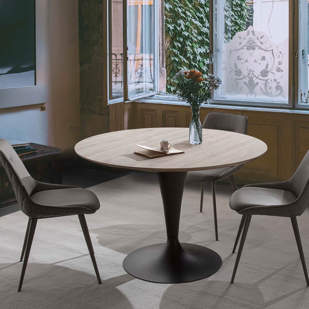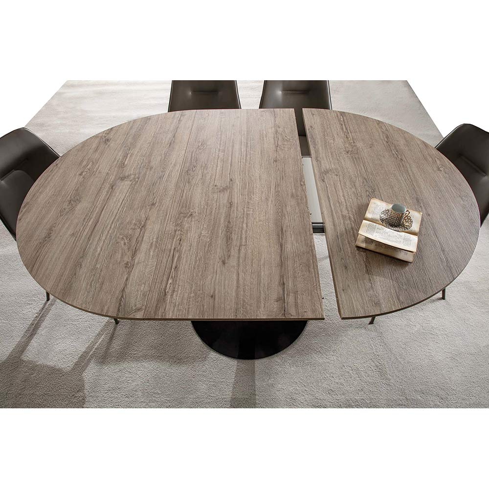 Wspaniały stół jadalny z okrągłym blatem z platerowanego drewna laminowanego (wys. 30 mm), teksturowane wykończenie dębowe z rozkloszowanymi krawędziami z płyty mdf i podstawy ze stali malowanej na czarno . To, co czyni ten stół wyjątkowym i szczególnie funkcjonalnym , to możliwość przedłużenia blatu dzięki zewnętrznej przedłużce o 50 cm, dzięki czemu uzyskuje się maksymalną długość 170 cm i pozwala pomieścić do 8 osób przy jednoczesnym zapewnieniu małego stolika. które mogą zoptymalizować przestrzeń Twojego domu po zamknięciu. Elegancja i funkcjonalność to słowa kluczowe, które najlepiej opisują ten nowoczesny mebel, który uosabia niezwykle współczesny wygląd, który może wzbogacić estetykę pomieszczenia poprzez trzeźwe dopełnienie mebla.