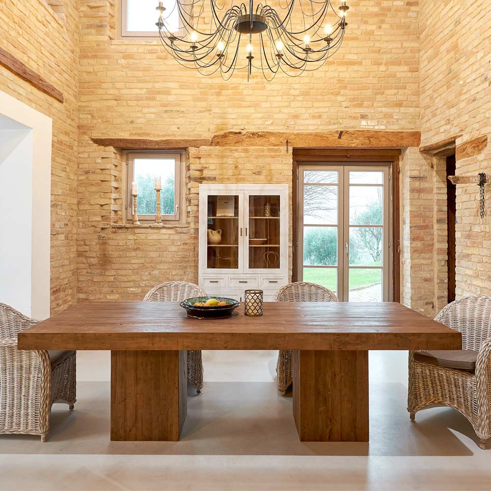 Stół do jadalni wykonany z drewna pochodzącego z recyklingu w naturalnym kolorze kawy z podwójną podstawą .