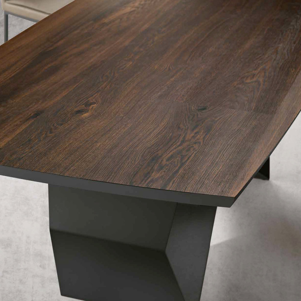 Metalowe nogi o odważnym, geometrycznym kształcie zostały pomalowane tak, aby pięknie kontrastowały z odcieniem drewna. Ta kombinacja materiałów nie tylko zapewnia solidną stabilność, ale także dodaje efektownego elementu wizualnego, dzięki czemu ten stół jest prawdziwym centralnym punktem w każdej jadalni lub przestrzeni na otwartej przestrzeni.