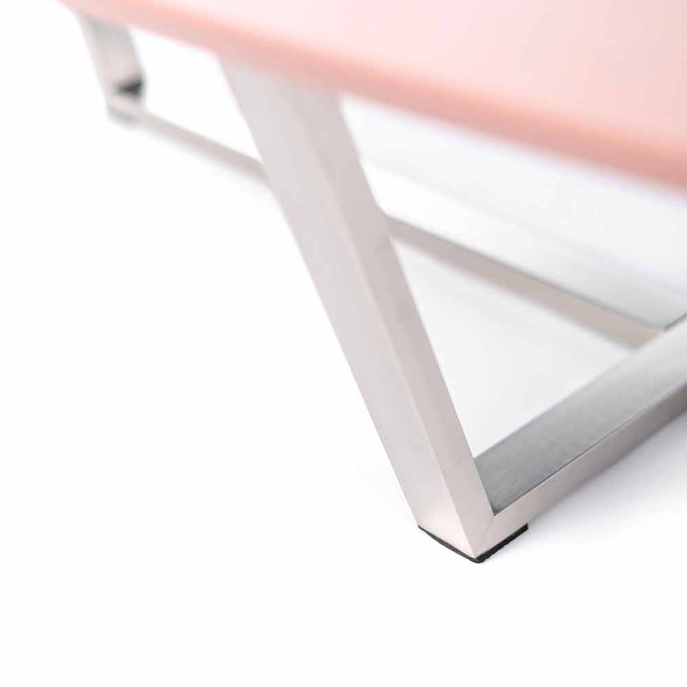 Stolik kawowy o nowoczesnym designie z blatem z MDF i chromowaną metalową podstawą.