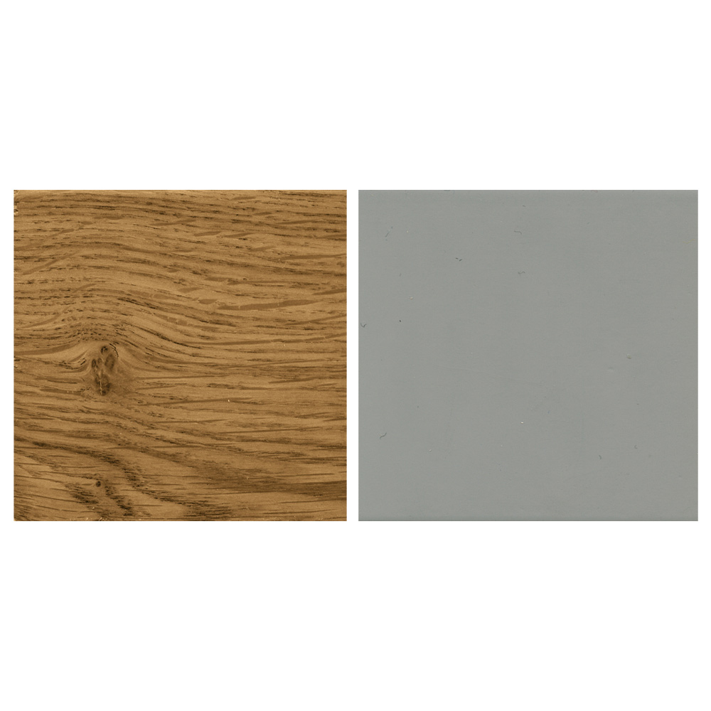 w kształcie beczki z litej dębowej płyty stolarskiej z wykończeniem z dębu wiejskiego i spodem w kolorze łupka. Oryginalna podstawa z zakrzywionej sklejki dębowej składa się z dwóch zakrzywionych i krętych elementów, które podtrzymują ważny blat, odtwarzając idealną równowagę kształtów.