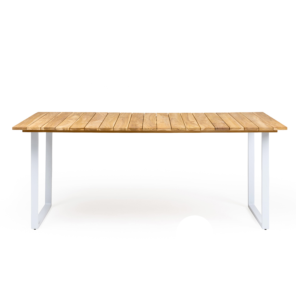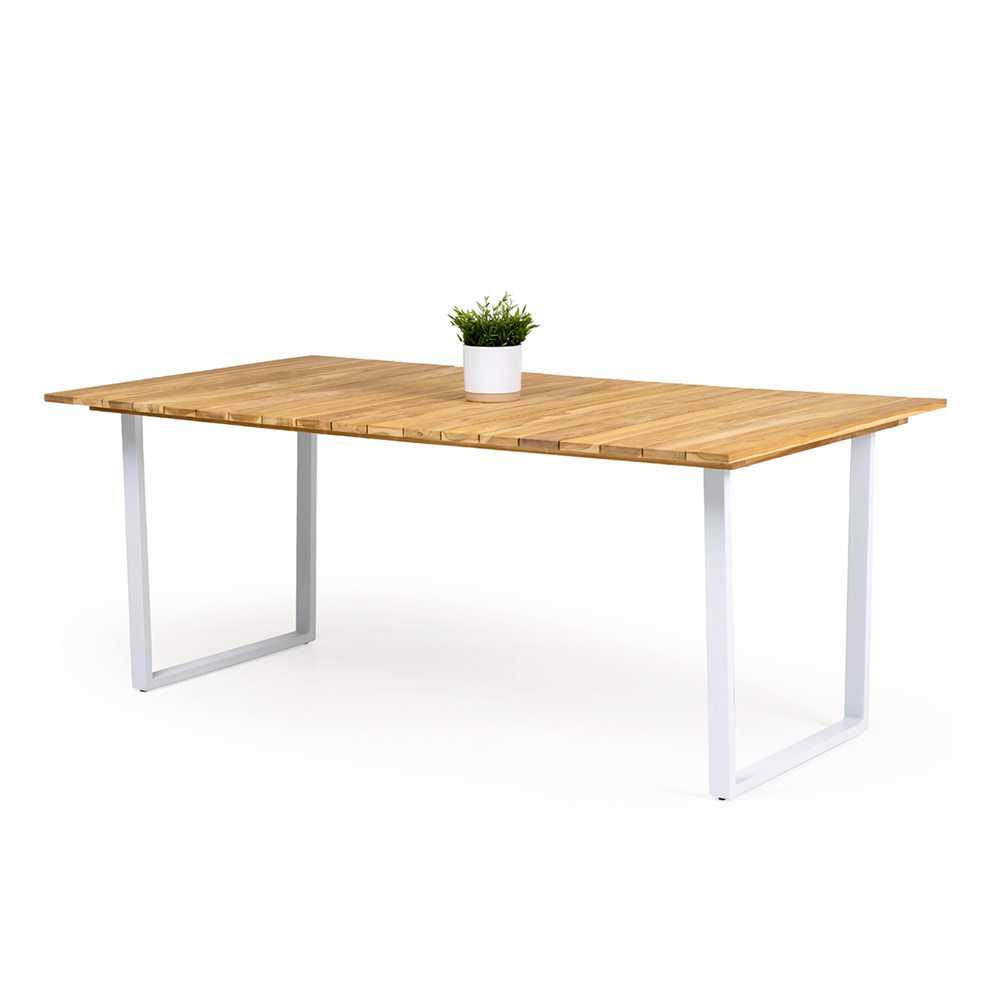 Stół ogrodowy wykonany z białej lakierowanej aluminiowej ramy i blatu z szczotkowanego naturalnego drewna tekowego.