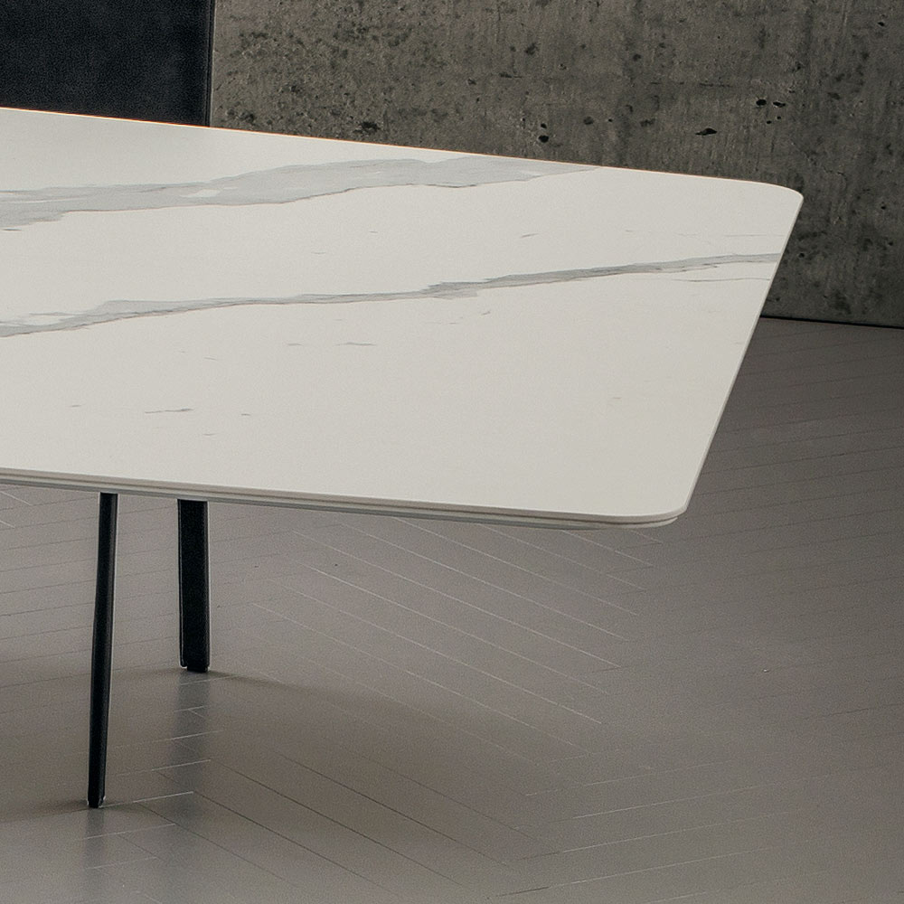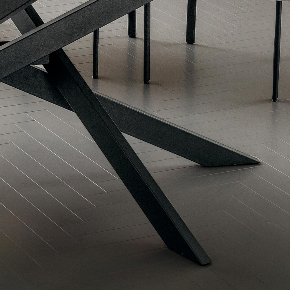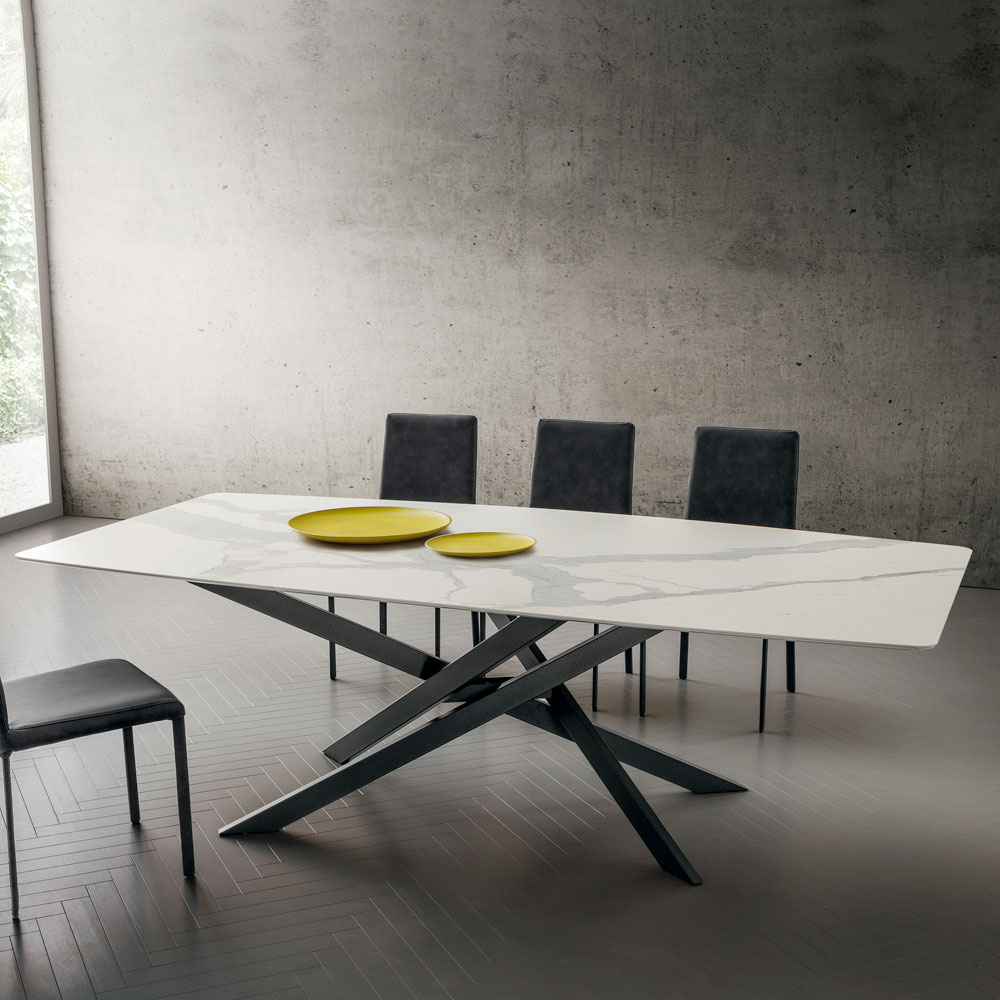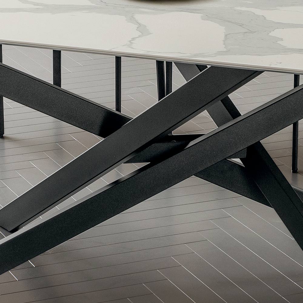 wyrafinowanej i oryginalnej estetyce , które charakteryzuje każde otoczenie, przynosząc ze sobą eleganckie i wyrafinowane elementy, które są jednocześnie nowoczesne i kreatywne. Osobliwością tego stołu jest podstawa ze skrzyżowanymi nogami, która wzbogaca jego projekt, rewolucjonizując styl całego pokoju, którego staje się bohaterem, podbijając każdą uwagę. Wspaniały beczkowaty blat dopełnia ostatecznego wyglądu stołu, nadając mu