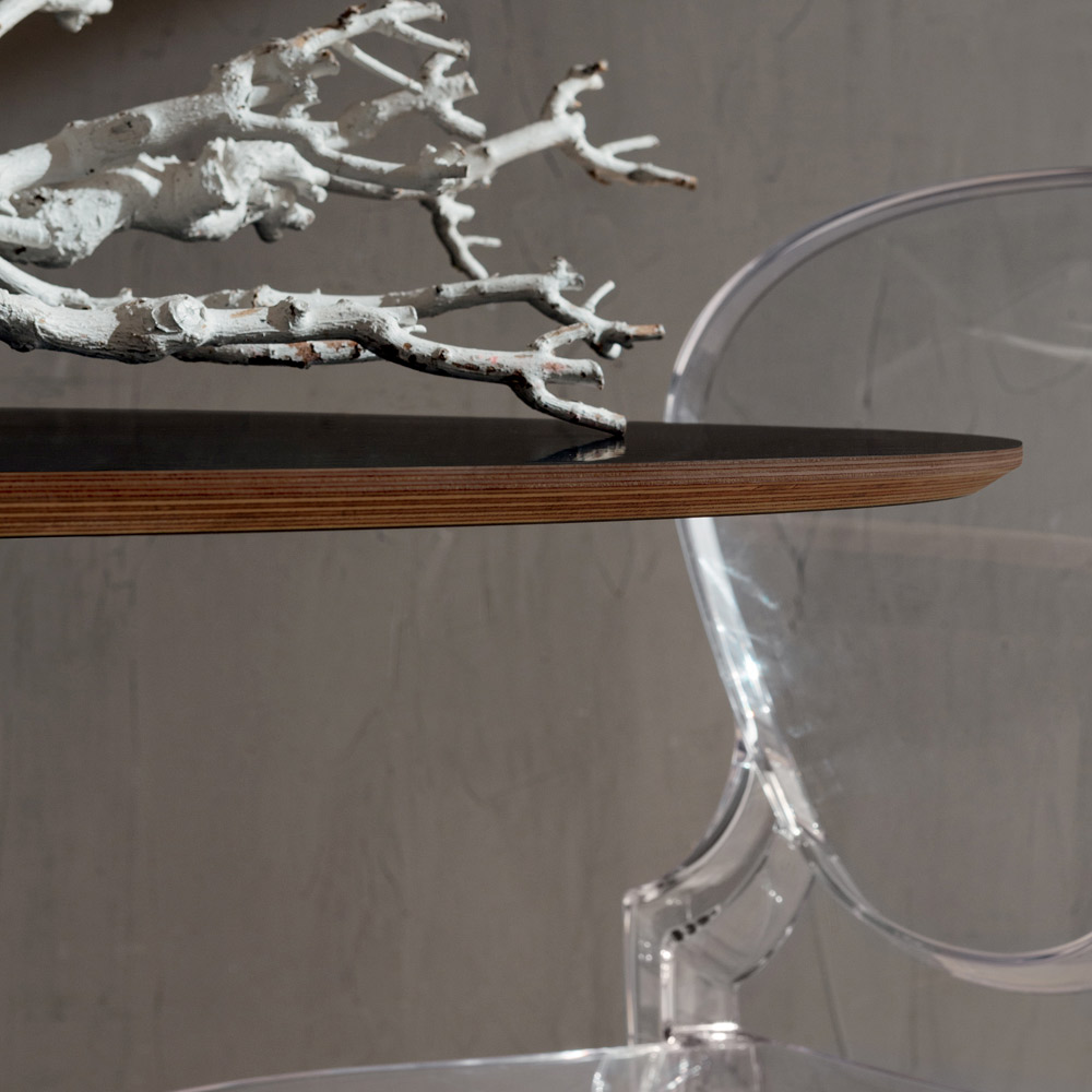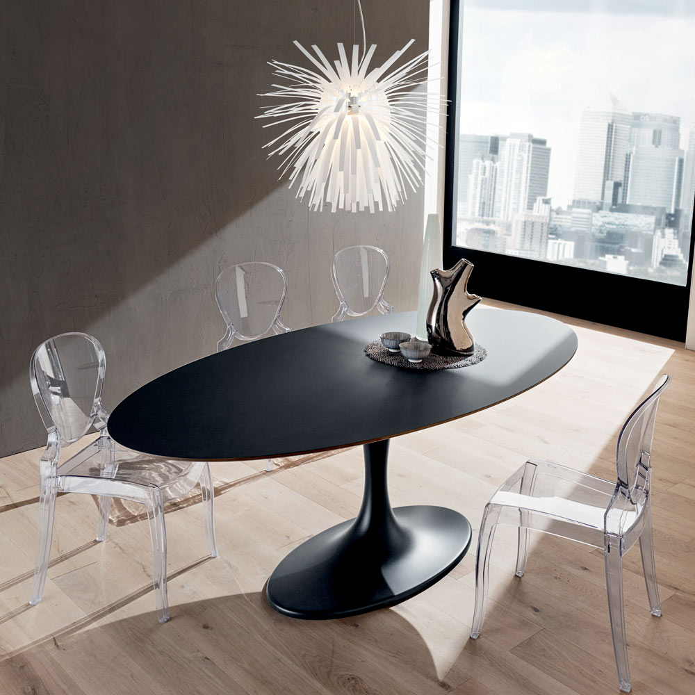 Stół do jadalni wykonany we Włoszech z owalnym blatem ze sklejki brzozowej z powierzchnią pokrytą czarnym wykończeniem fenix i podstawą z marmuru mineralnego (marmur syntetyczny). Niezwykle oryginalny i kreatywny styl charakteryzuje ten mebel z elegancką duszą i niemal futurystyczną estetyką, zdolną uczynić każde otoczenie wyjątkowym dzięki swojej szczególnie innowacyjnej osobowości . Niezwykłe linie biegnące wzdłuż całej podstawy idealnie komponują się z owalnym kształtem blatu, tworząc wrażenie ruchu i wspaniałą harmonię kształtów . Szczególny kontrast między blatem ze sklejki a poszyciem fenix jeszcze bardziej wzbogaca ostateczny projekt stołu, czyniąc go szczególnie odpowiednim dla tych, którzy kochają urządzać swoje przestrzenie w wyrafinowany i całkowicie rewolucyjny sposób. Zastosowane materiały wysokiej jakości i wykonanie w 100% Made in Italy podnoszą jego jakość i wartość, dzięki czemu możemy zaoferować rozwiązanie meblowe, które jest równie piękne i eleganckie, jak solidne, trwałe i funkcjonalne.