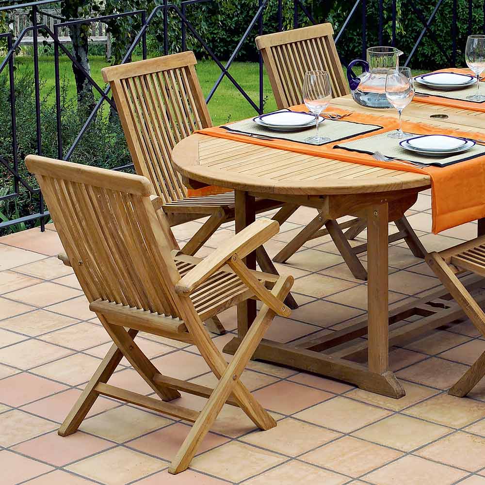 Rozkładany stół ogrodowy z drewna tekowego z krzesłami i fotelami.