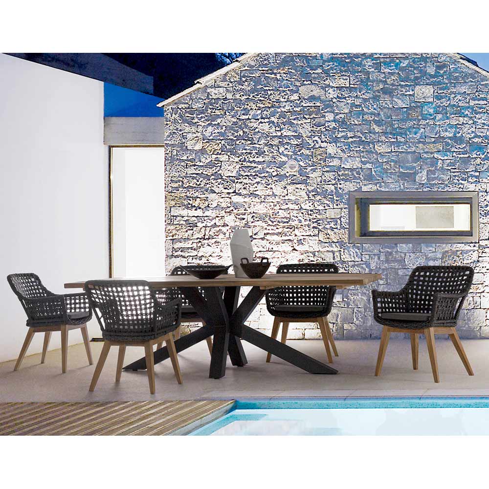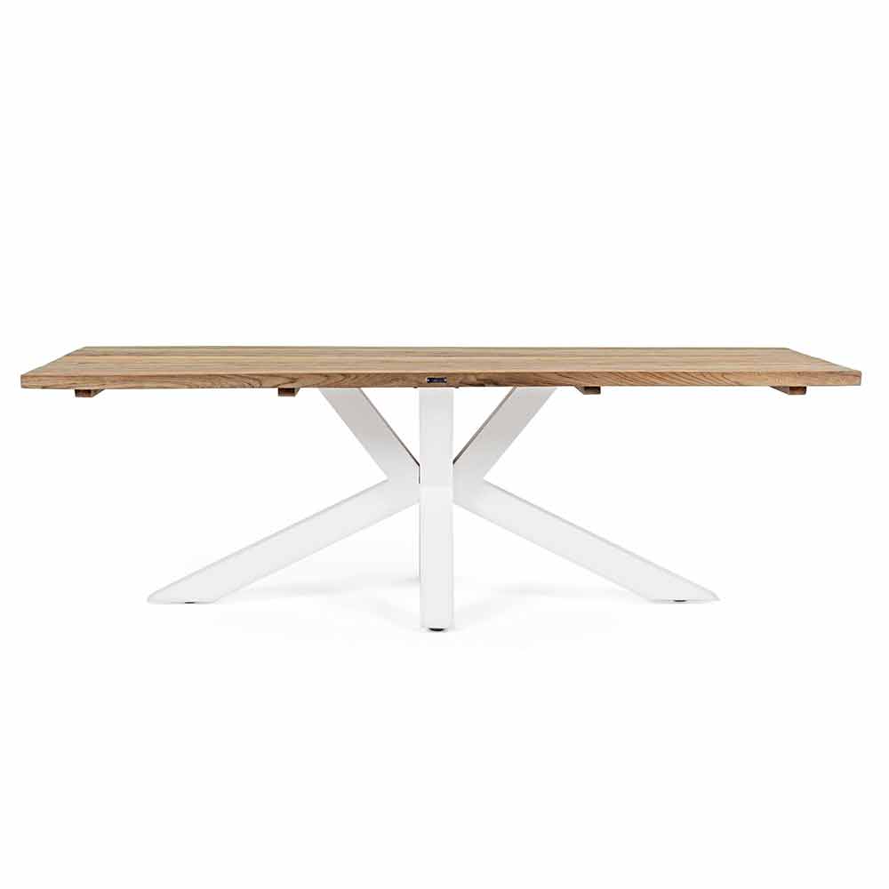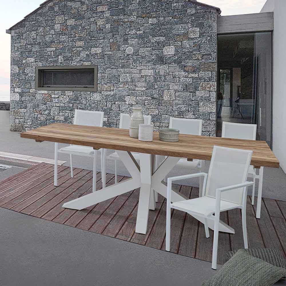 Nowoczesny stół ogrodowy z białymi lub czarnymi aluminiowymi nogami i blatem z drewna tekowego dla 10 osób.