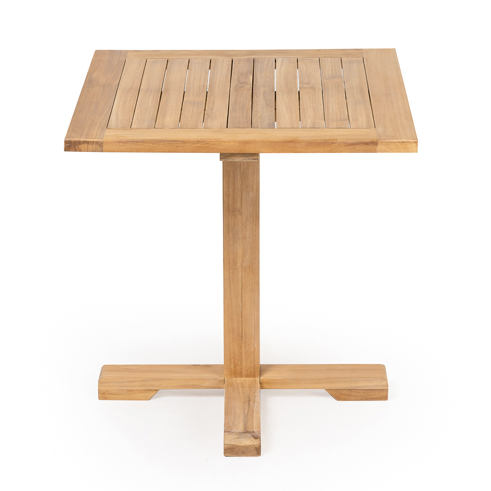 Stół ogrodowy z nogą centralną, wykonany z drewna tekowego, dostępny w różnych rozmiarach.