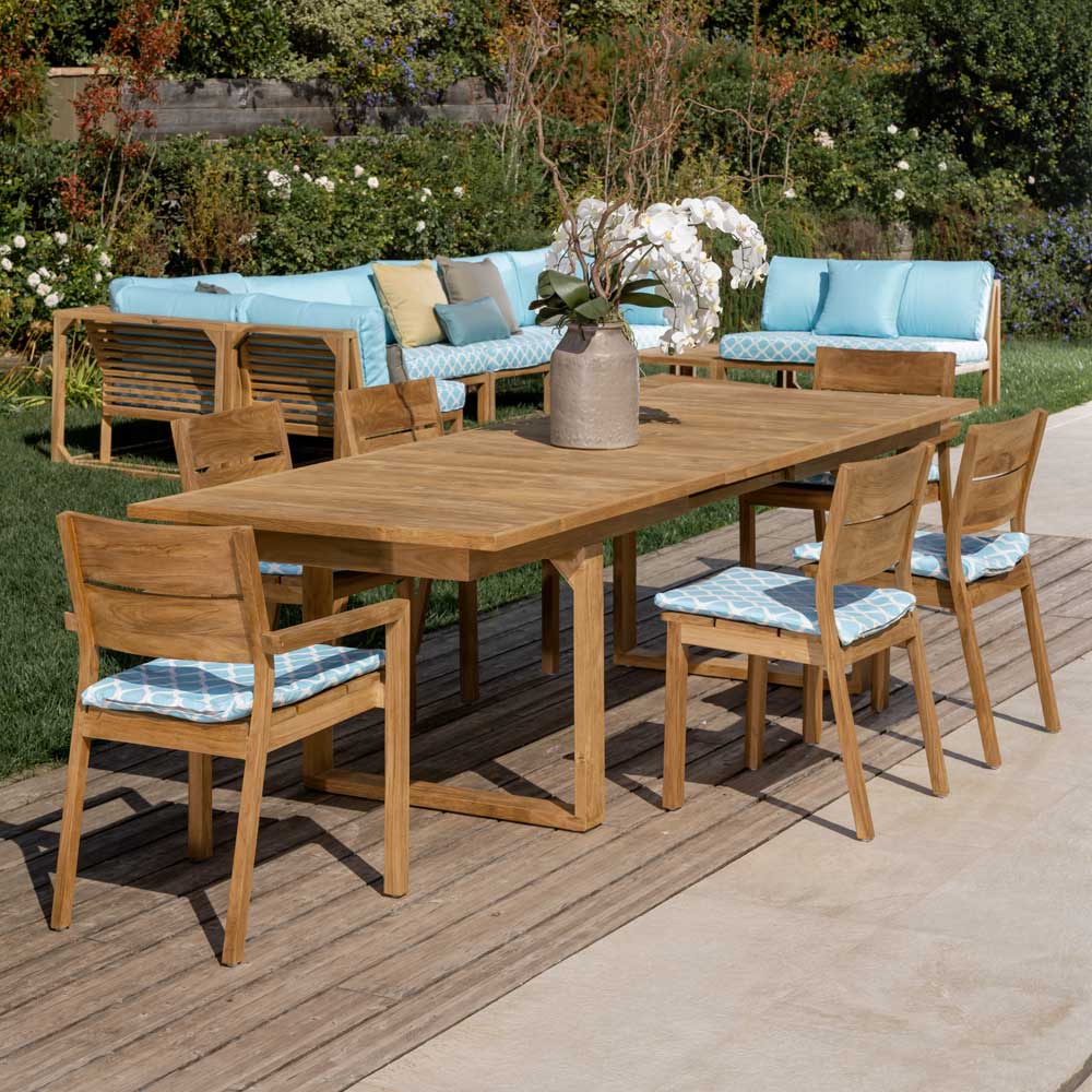 Rozkładany stół ogrodowy o długości 270 cm, wykonany z drewna tekowego z naturalnym szczotkowanym wykończeniem.