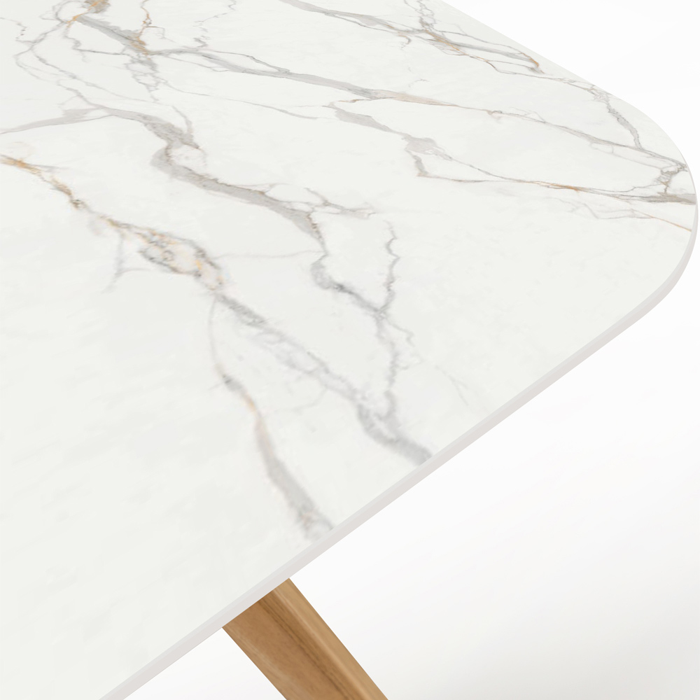 wyprodukowany we Włoszech. Ten stolik ogrodowy z ceramicznym blatem Calacatta Oro to hołd dla ponadczasowej elegancji i subtelnego luksusu. Łączy ciepłą i przytulną drewnianą podstawę z ceramicznym blatem, który doskonale imituje marmur Calacatta Oro, znany z unikalnego złotego usłojenia na białym tle.