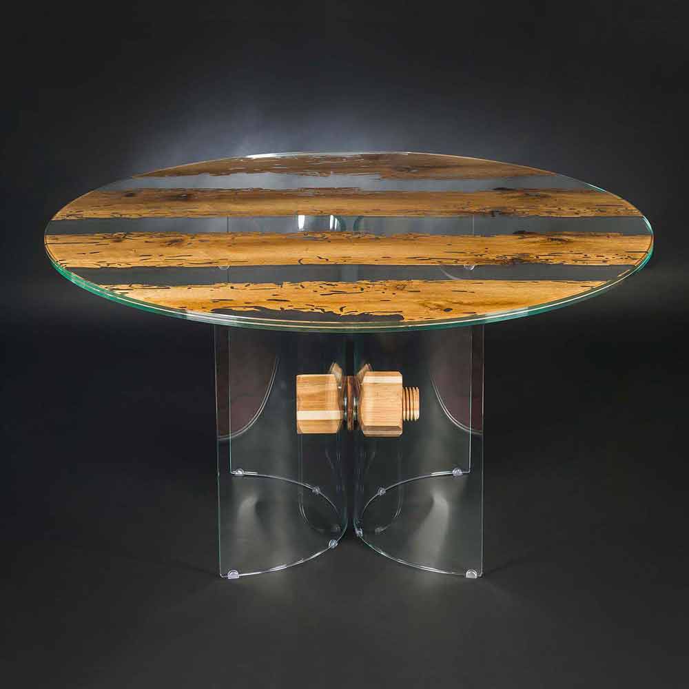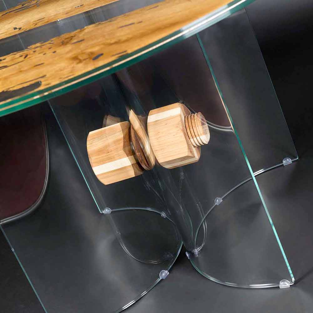 Stół wykonany z dwóch warstw szkła 10+10 mm, między nimi znajduje się cieńka warstwa briccola wood z dębu.