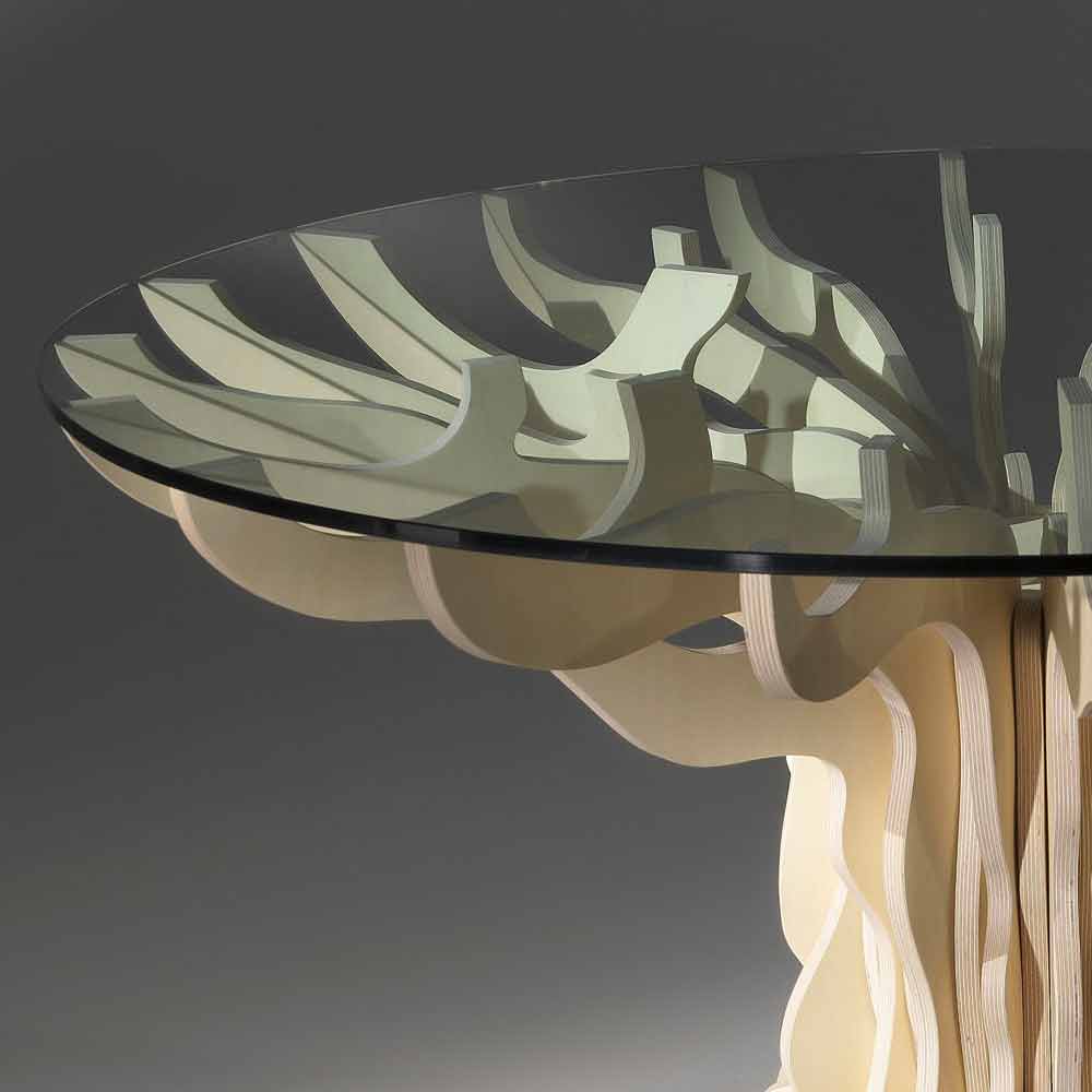 Nowoczesny stół wykonany z naturalnej sklejki brzozowej. Niezwykle przejrzysty blat ze szkła hartowanego.