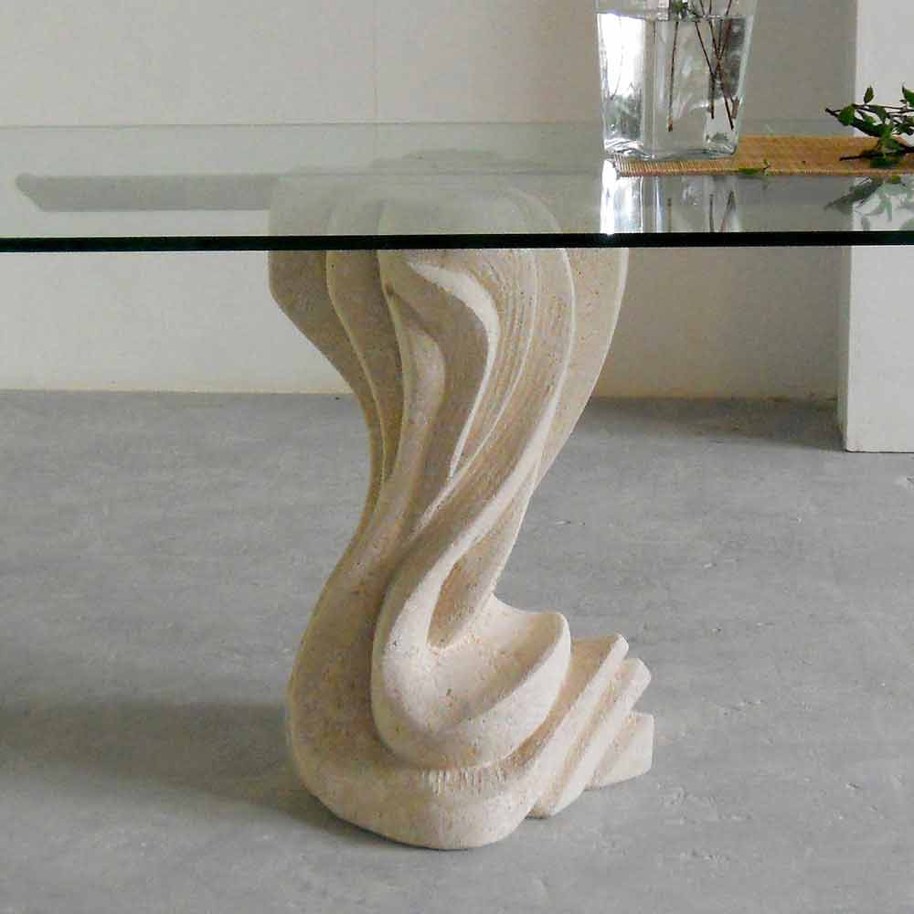 Nowoczesny stół wykonany we Włoszech, z centralną podstawą z naturalnego kamienia Vicenza,wyrzeźbione ręcznie z litego bloku, ze szklanym blatem o grubości 15 cm, przymocowane do podstawy za pomocą wyjmowanego stalowego kołnierza.