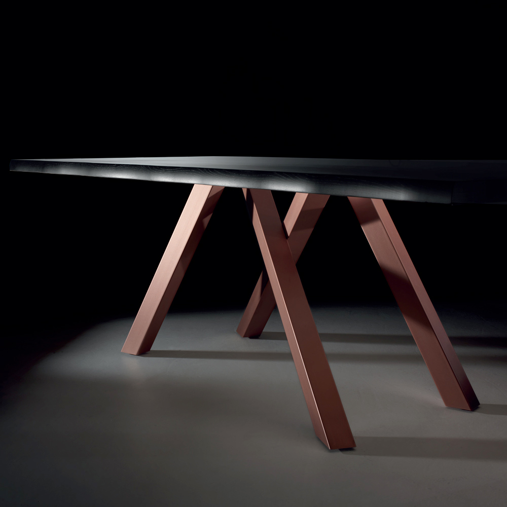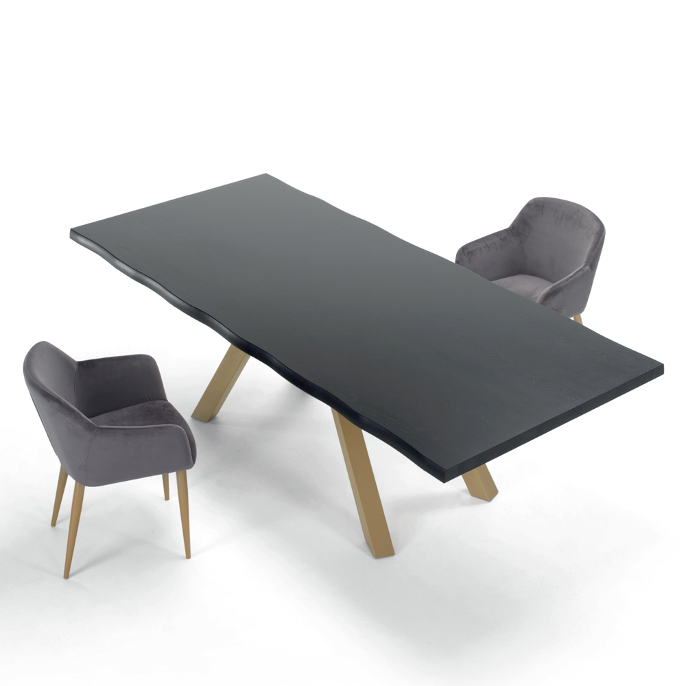 Nowoczesny stół kuchenny z blatem z fornirowanego drewna i podstawą ze złota, różowego złota lub grafitowej stali, wyprodukowany we Włoszech.