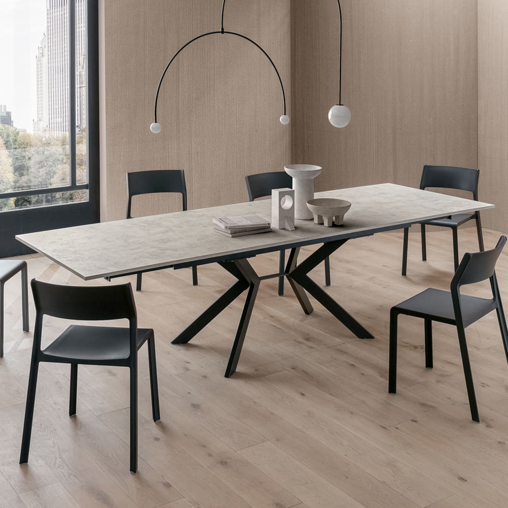 Blat HPL z żyłkowaniem oferuje wyrafinowaną i naturalną estetykę, z odporną powierzchnią, idealną do codziennego użytku. Dzięki systemowi rozkładania z bocznymi przedłużeniami stół rozkłada się z niezwykłą łatwością, dostosowując się do rodzinnych obiadów lub wieczorów ze znajomymi.