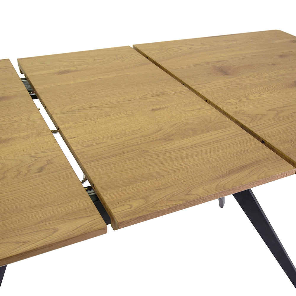 Funkcjonalność i elegancja w jednym rozkładanym stole! Stół ten łączy w sobie solidną i nowoczesną czarną, malowaną proszkowo metalową ramę z ciepłym i przytulnym blatem z płyty MDF z efektem naturalnego drewna.