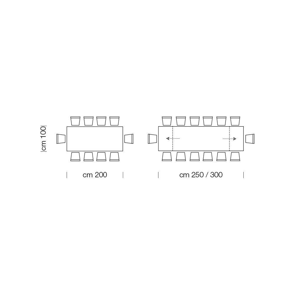 - Dł. 200 (300) x gł. 100 x wys. 76,5 cm 14 siedzeń z możliwością przedłużenia za pomocą 2 zewnętrznych przedłużek o długości 50 cm.