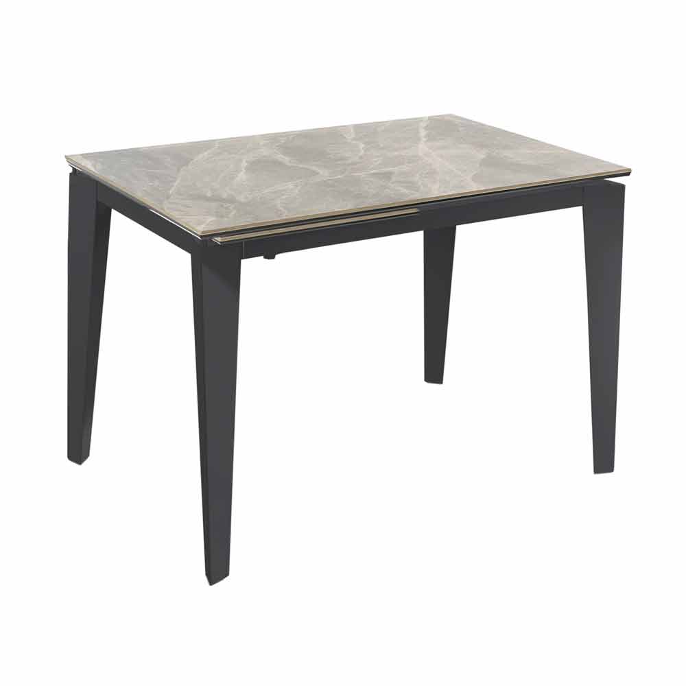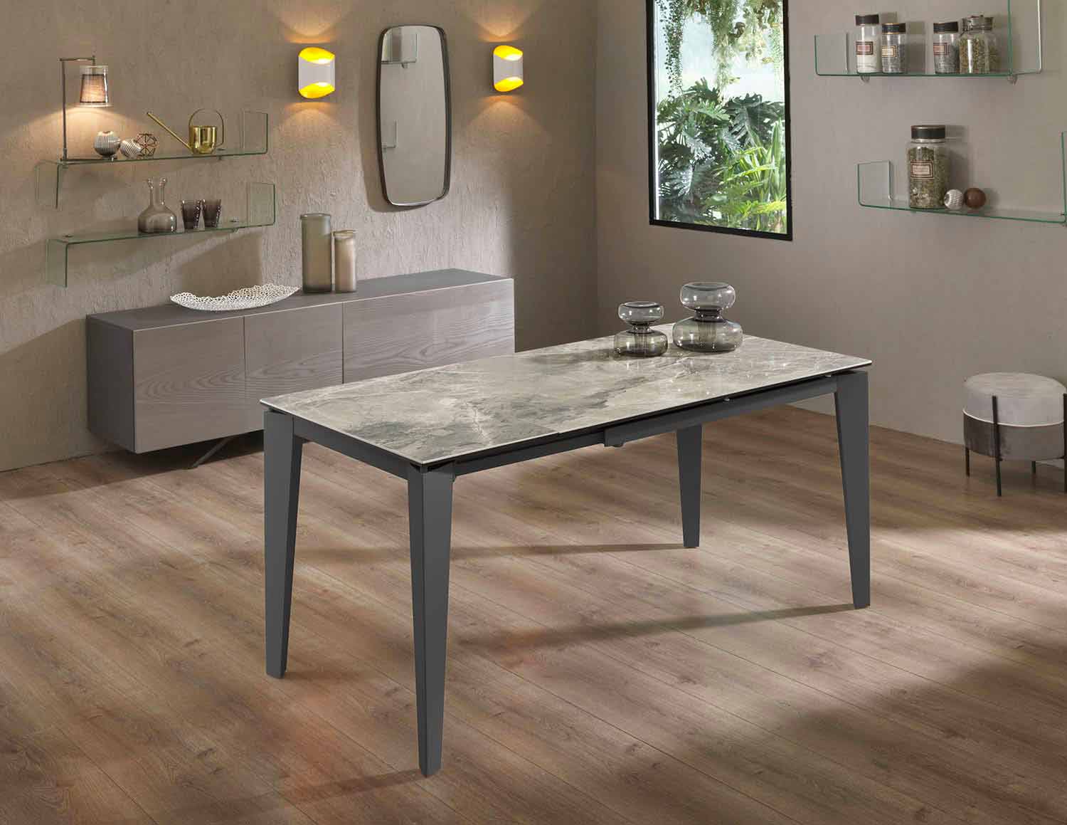 Syrta to prostokątny stół jadalny charakteryzujący się możliwością rozłożenia nawet do 170 cm, aby uzyskać w razie potrzeby więcej miejsca przy stole, a co za tym idzie większy komfort, idealny do goszczenia przyjaciół i bliskich bez utraty komfortu. Stół wykonany jest z malowanej metalowej konstrukcji i ceramicznego blatu na hartowanym szkle w kolorze antracytu, co sprawia, że stół jest elegancki i jednocześnie wytrzymały, a także jest wyposażony w wewnętrzne przedłużenia, również ceramiczne na białym szkle.
