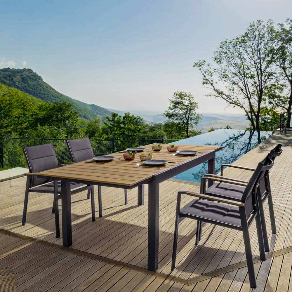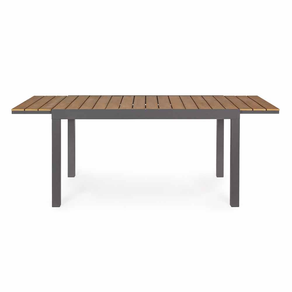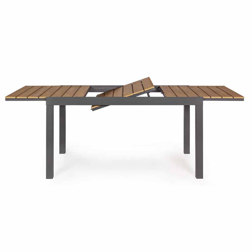 Stół do jadalni na zewnątrz z wysuwanym blatem w wykończeniu z drewna.