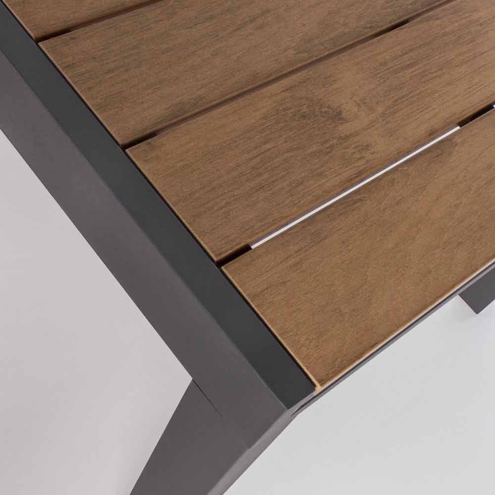 Konstrukcja aluminiowa malowana proszkowo (poliester). Blat z polywood (materiał kompozytowy o wyglądzie podobnym do drewna) 90% styropian 10% sbs kolor teak. Składane przedłużenie. Śruby ze stali ocynkowanej.