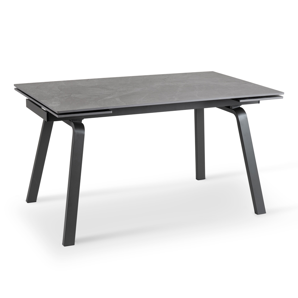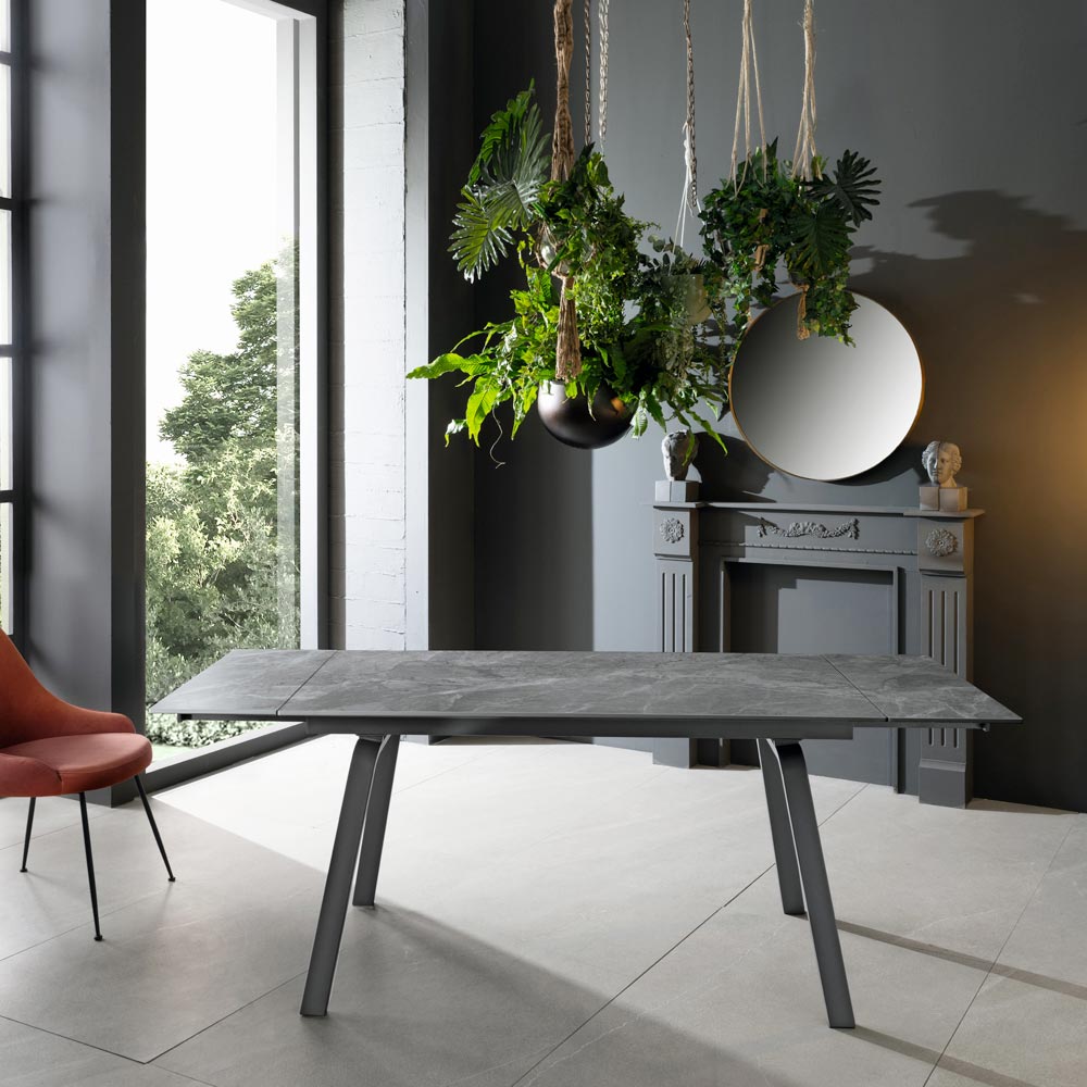 To, co przyciąga uwagę, to wyrazista siła tego rozkładanego stołu w stylu współczesnym i industrialnym. Jego konstrukcję charakteryzuje elegancki blat wykonany ze spiekanego kamienia, który gustownie komponuje się z solidną metalową podstawą. Oferuje wiele możliwych kombinacji wykończeń prostokątnego blatu i wykończeń podstawy, zadowalając osobistą ekspresję i gust oraz odzwierciedlając ducha kontekstu, w którym jest umieszczony. Dzięki swojej możliwości rozbudowy staje się idealnym sprzymierzeńcem w tworzeniu wyjątkowych i ciepłych przestrzeni towarzyskich.
