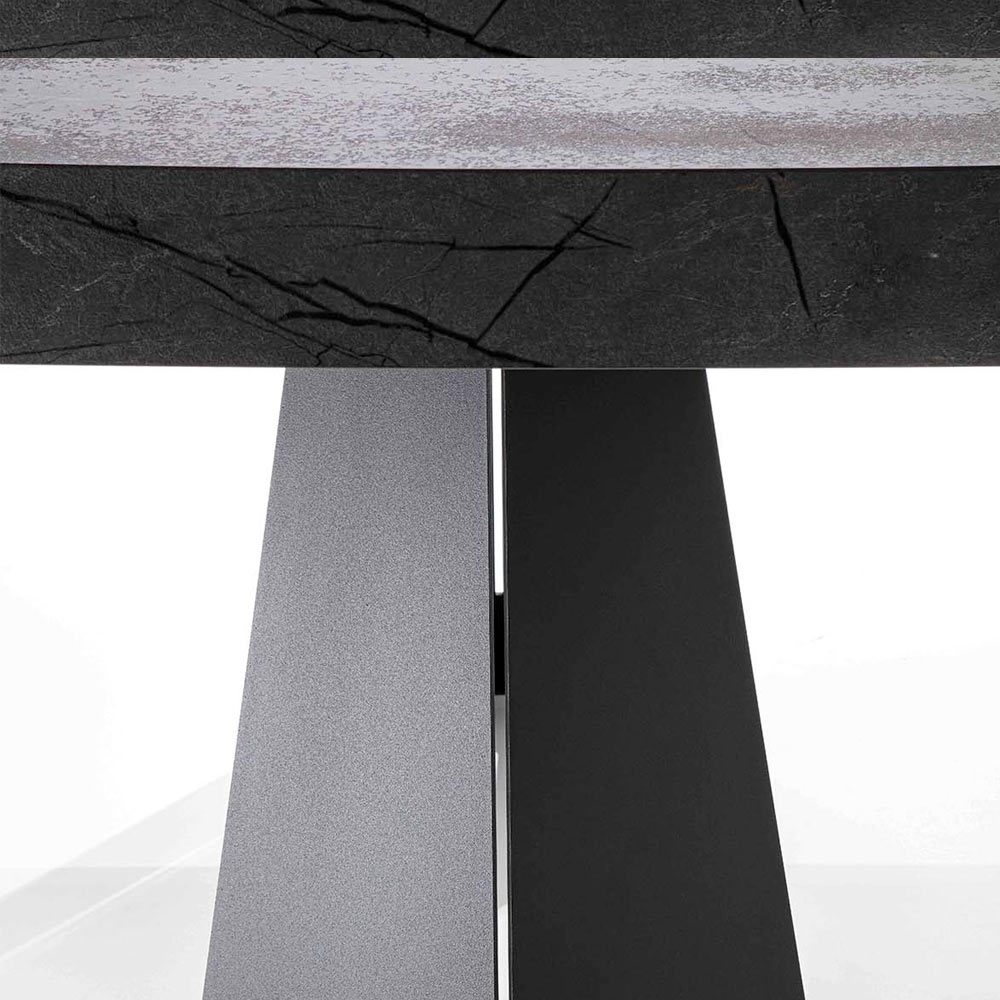 Wyjątkowy i awangardowy design nadaje mu szczególna czarna podstawa, która dzięki niezwykłym liniom wzbogaca jego estetykę i wzmacnia jej mocny charakter, czyniąc go idealnym stołem jadalnym, który może uzupełnić wyposażenie stylowych wnętrz. nowoczesny i wyrafinowany. Różne wykończenia dostępne dla blatu pozwalają również jeszcze bardziej zwiększyć jego