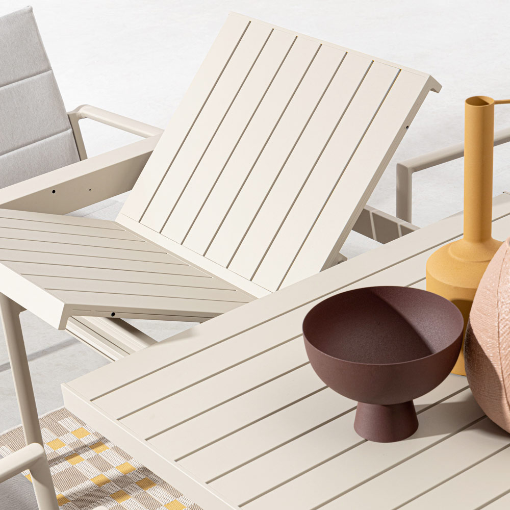 Ten stół ogrodowy to prawdziwy klejnot minimalistycznego i funkcjonalnego designu . Wysokiej jakości aluminiowa powierzchnia, charakteryzująca się czystymi liniami, przywołuje nowoczesny i wyrafinowany styl, który nie pozostaje niezauważony. Neutralne kolory sprawiają, że jest on niezwykle wszechstronny i nadaje się do każdego środowiska zewnętrznego, od miejskiego balkonu po patio wiejskiej willi. Nie tylko estetyczny, ale także niezwykle praktyczny i trwały ; Stół ten został zbudowany tak, aby wytrzymać działanie żywiołów, zapewniając trwałość i stabilność w miarę upływu czasu. Dzięki prostym liniom i eleganckiej sylwetce stół ten staje się bohaterem każdej miłej chwili na świeżym powietrzu, oferując maksymalny komfort i gościnność . Ten stół ogrodowy, będący wyrazem czystego współczesnego stylu , jest idealnym wyborem dla tych, którzy lubią witać, mieszkać i dzielić swoje życie na świeżym powietrzu z klasą i prostotą .