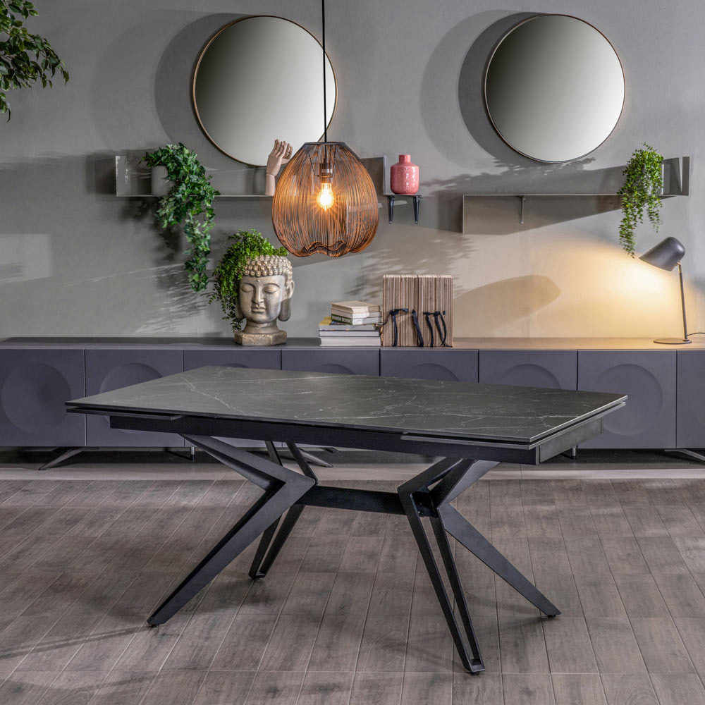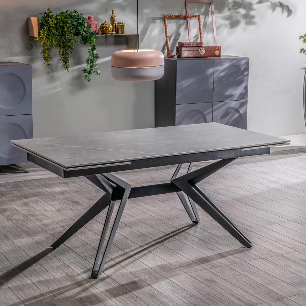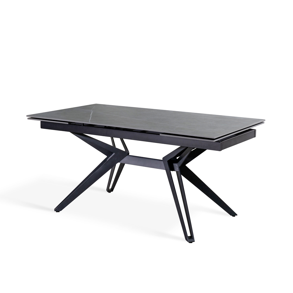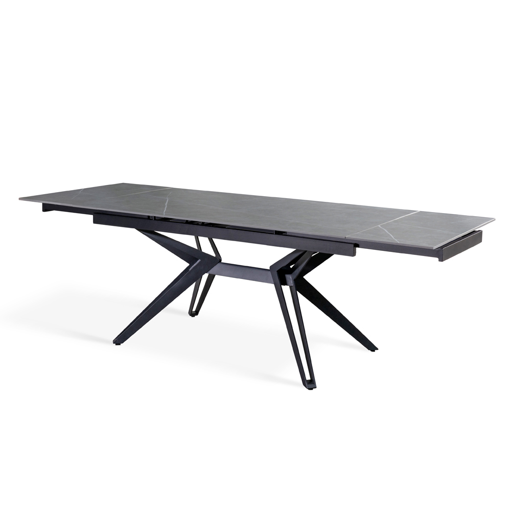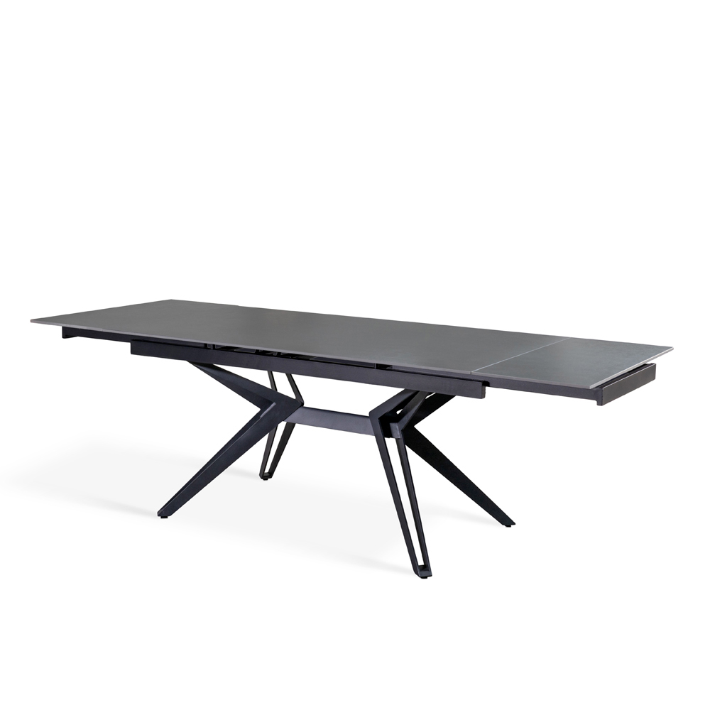 To, co przyciąga uwagę, to wyrazista siła tego rozkładanego stołu w stylu współczesnym i industrialnym. Jego konstrukcję charakteryzuje elegancki blat wykonany z ceramiki, który gustownie komponuje się z solidną metalową podstawą. Oferuje wiele możliwych kombinacji wykończeń prostokątnego blatu i wykończenia podstawy, zadowalając osobistą ekspresję i gust oraz odzwierciedlając ducha kontekstu, w którym jest umieszczony. Dzięki swojej możliwości rozbudowy może pomieścić aż 10 osób i staje się idealnym sprzymierzeńcem w tworzeniu wyjątkowych i ciepłych przestrzeni towarzyskich.