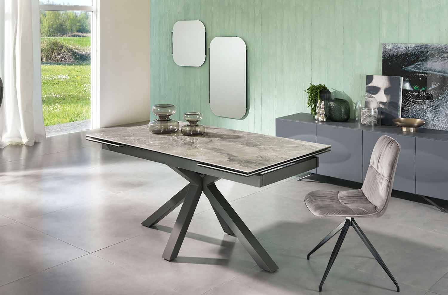 Laryssa to stół jadalniany charakteryzujący się zastosowaniem innowacyjnych i wytrzymałych materiałów, które sprawiają, że idealnie nadaje się do jadalni czy kuchni, łącząc piękno i praktyczność, umożliwiając tym samym optymalne użytkowanie i jednocześnie nadając styl każdemu otoczeniu. Stół wykonany jest z metalowej konstrukcji malowanej na kolor antracytowy oraz ceramicznego blatu na szkle hartowanym, również w kolorze antracytowym, co sprawia, że stół jest solidny i wytrzymały. Przedłużenia znajdują się wewnątrz stołu i są również wykonane z ceramiki na szkle w kolorze antracytu.