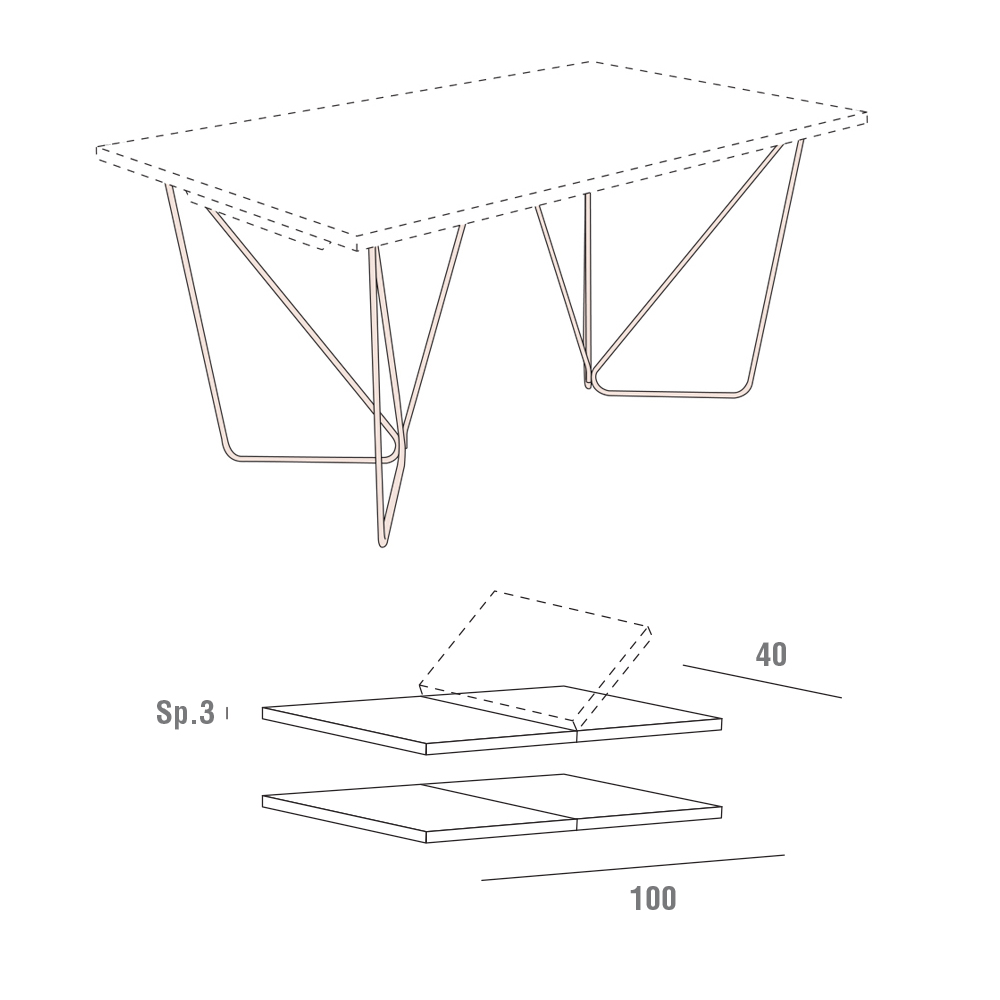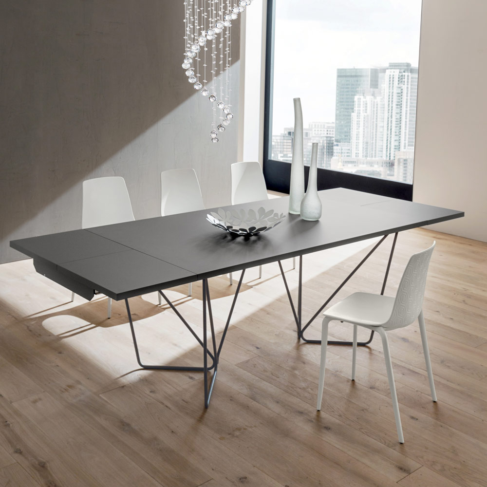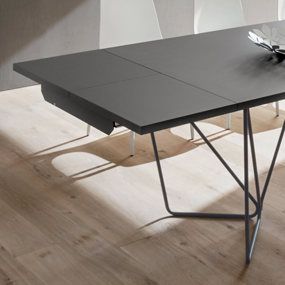 dwóm przedłużeniom bocznym (po 40 cm każdy) pasującym do blatu ze składanym mechanizmem otwierania. W ten sposób stół staje się rozwiązaniem meblowym szczególnie odpowiednim dla tych, którzy uwielbiają organizować lunche i kolacje, goszcząc przyjaciół i krewnych na wspaniałe chwile w towarzystwie, a po zamknięciu wracając, aby zająć mniejszą przestrzeń. Tym, co podnosi jakość i wartość stołu, jest wybór zastosowania fenix, materiału, który dzięki zastosowaniu