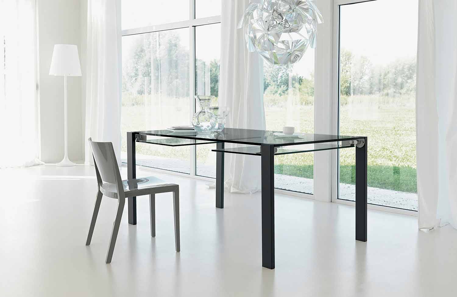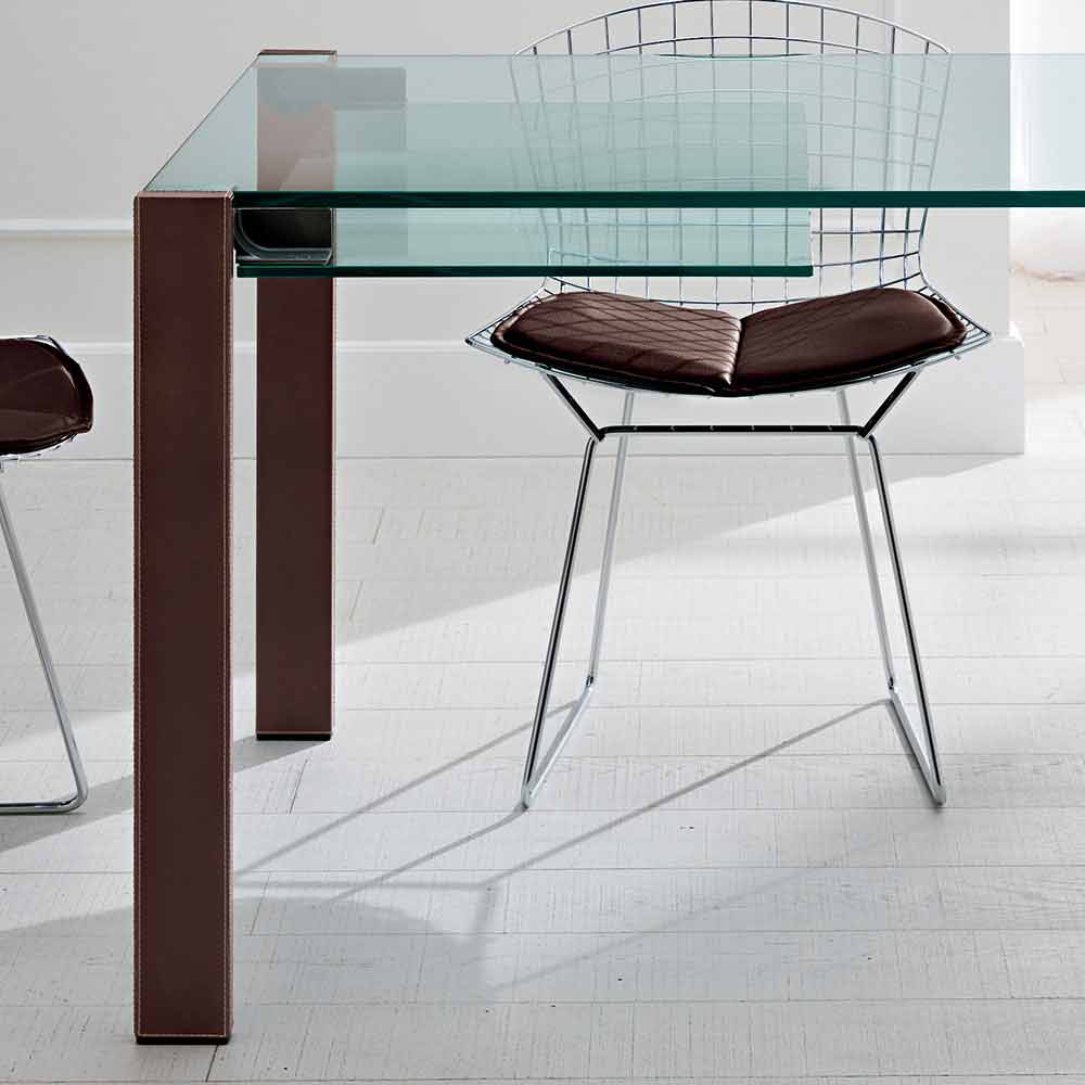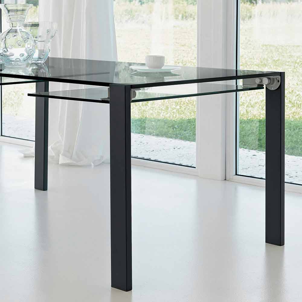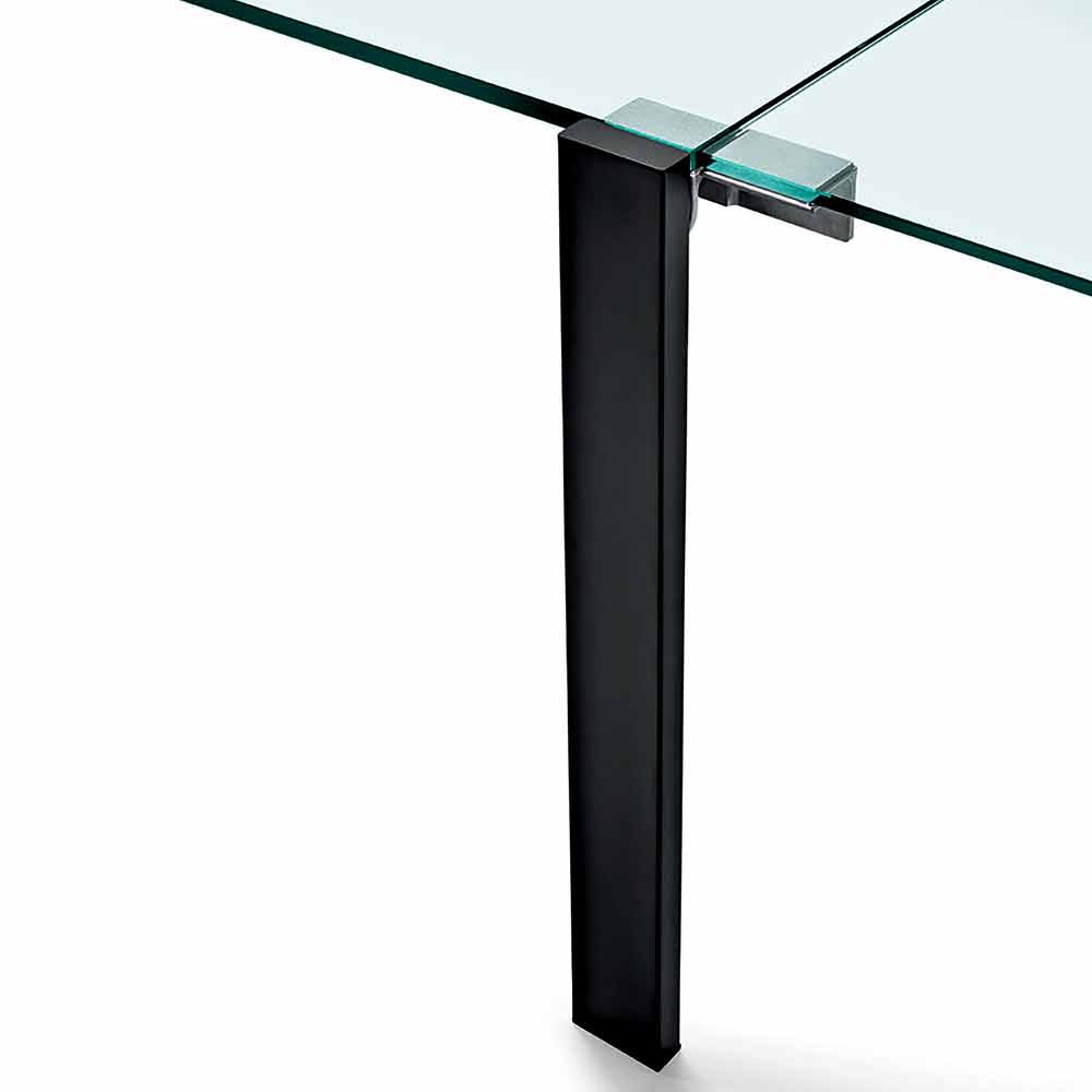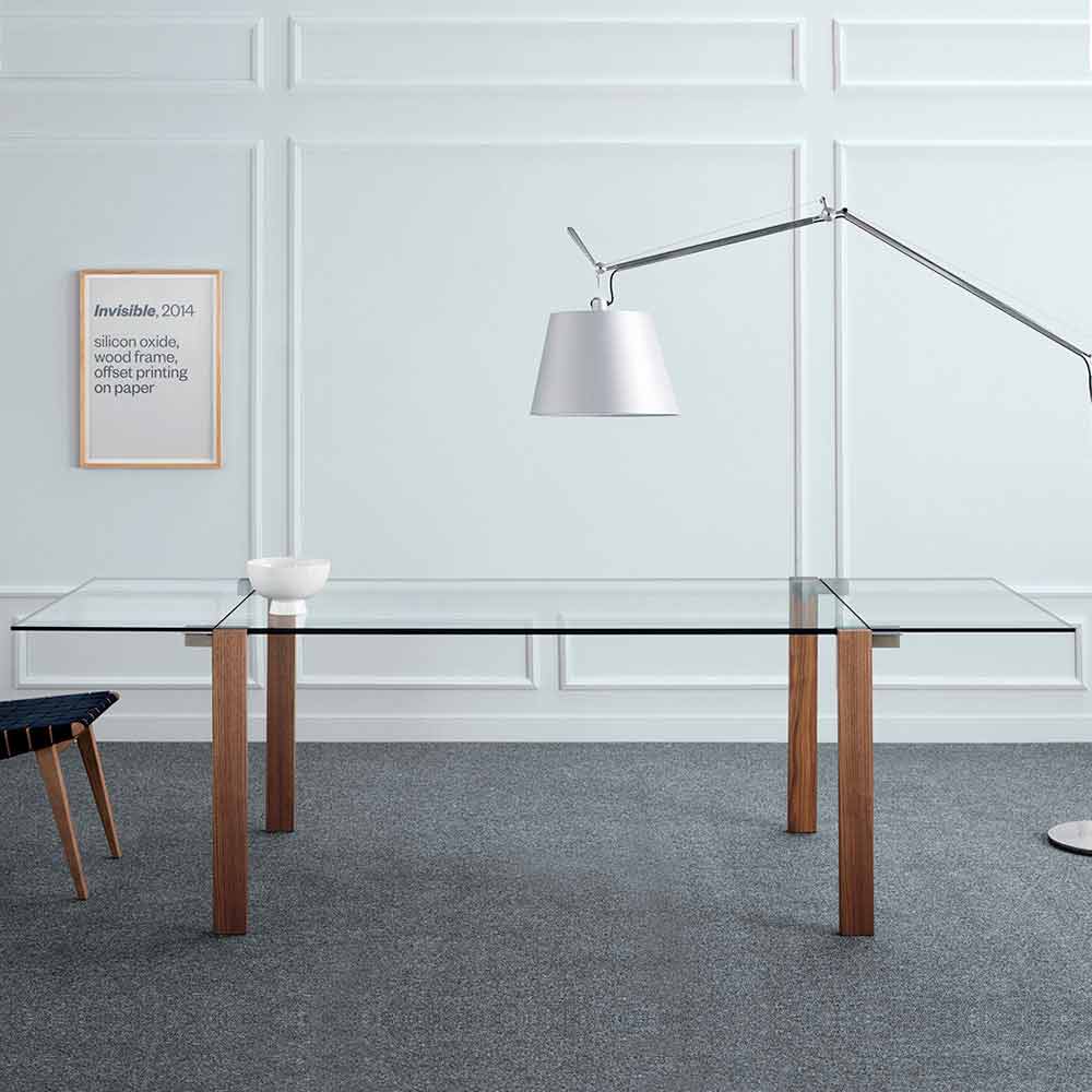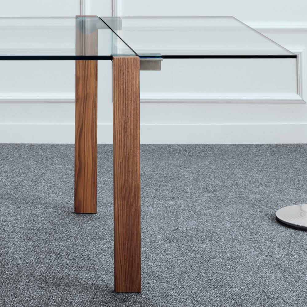 Przezroczysty szklany stolik z możliwością przedłużenia do 12 miejsc z podstawą metalową lub orzechową canaletto, wyprodukowany we Włoszech.