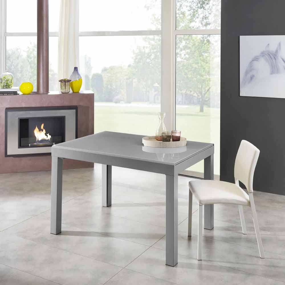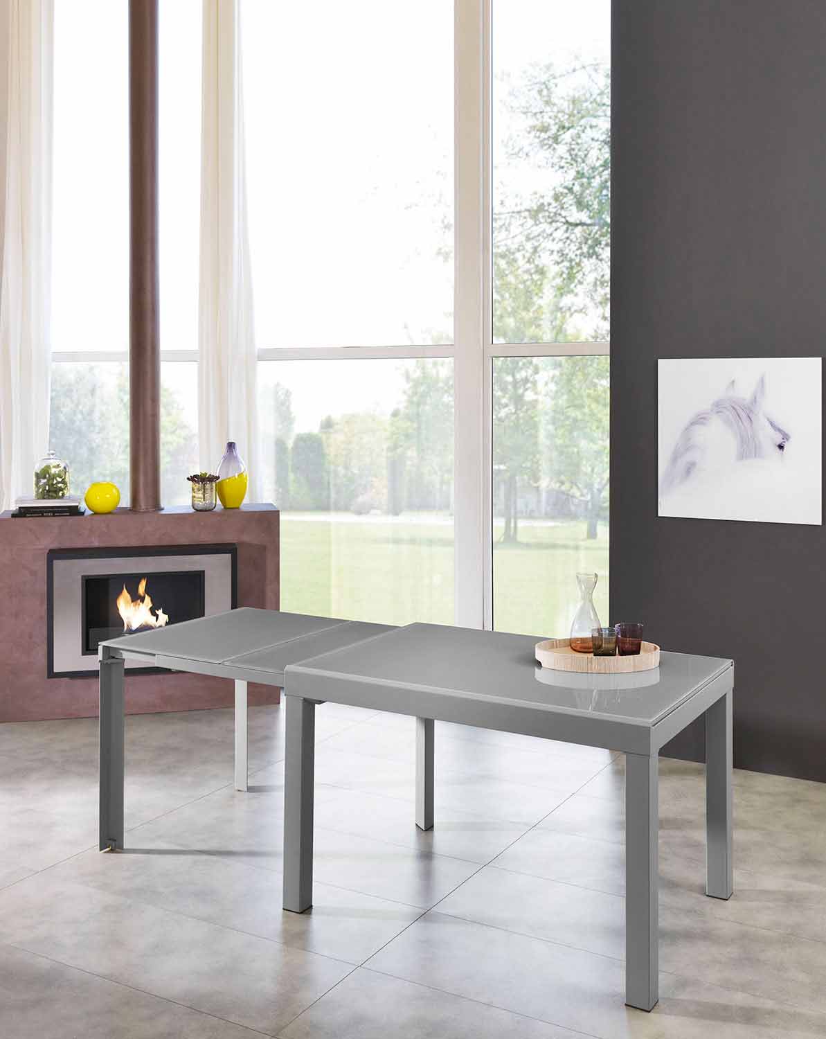 Stół wykonany jest z metalowej konstrukcji malowanej na szaro oraz z hartowanego szkła i blatu w tym samym kolorze z melaminy oraz wewnętrznych przedłużeń, również z szarego hartowanego szkła.