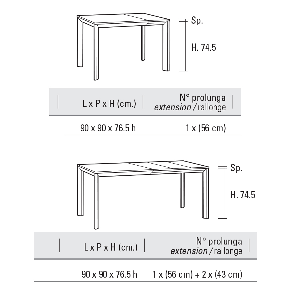 - Dł. 90/232 x gł. 90 x wys. 76,5 cm (1 przedłużenie 56 cm + 2 przedłużenia 43 cm).