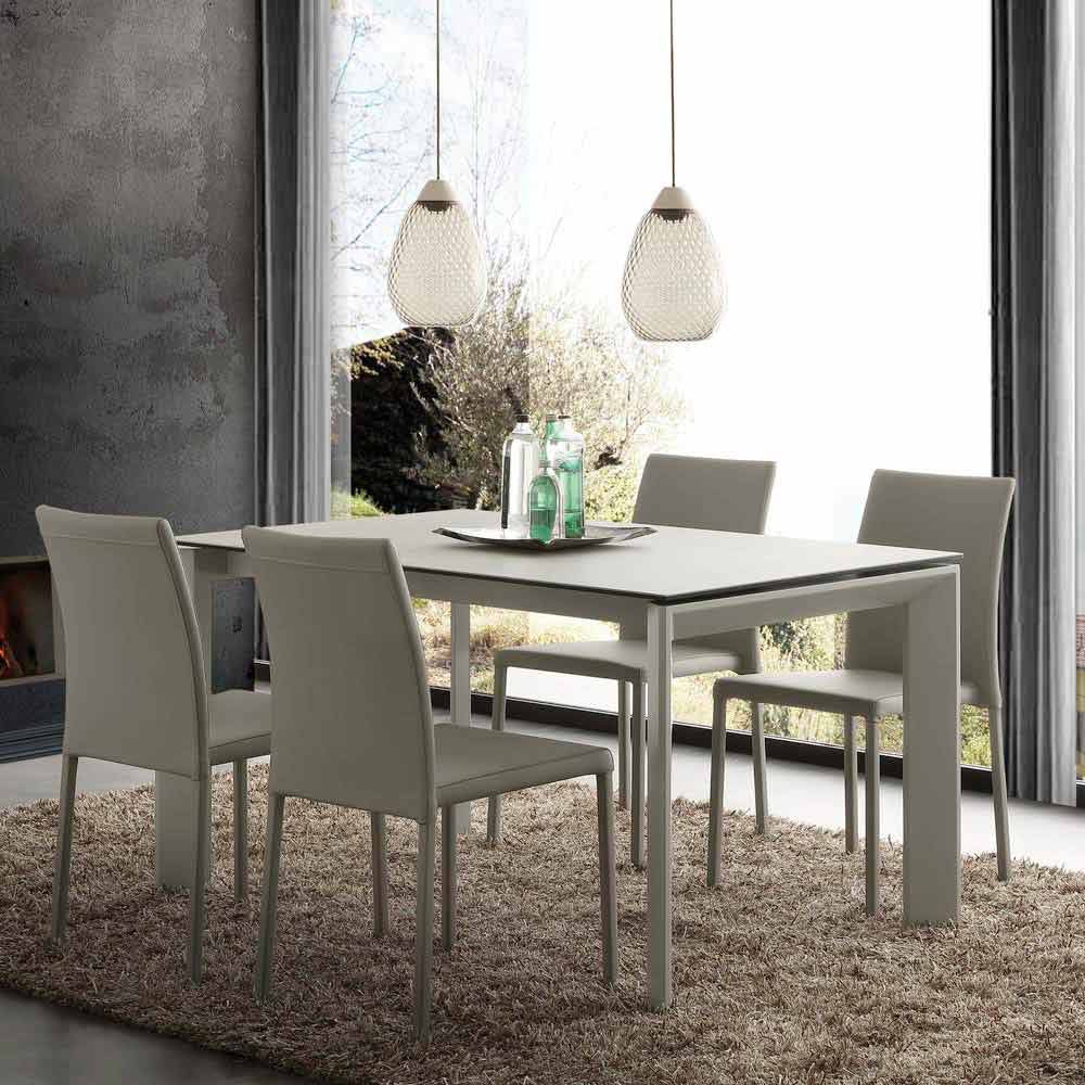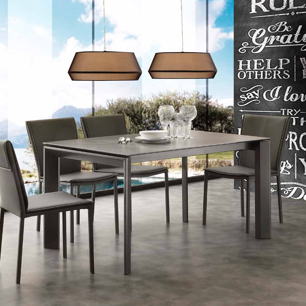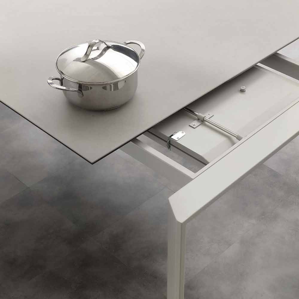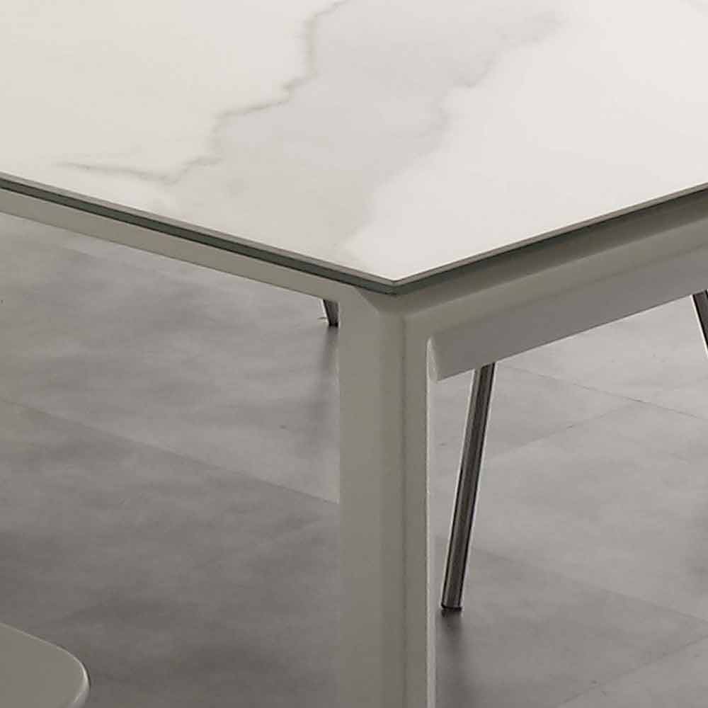 Blat wykonany jest ze szkła i ceramiki (3 + 8 cm) i jest dostępny w wykończeniach błotnoszary, biały marmur, cementowo-szary i antracytowo-szary. Rama stołu pasuje do blatu.