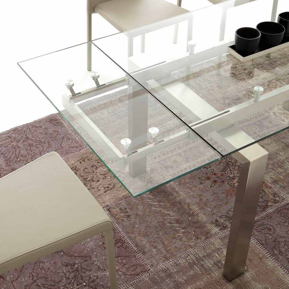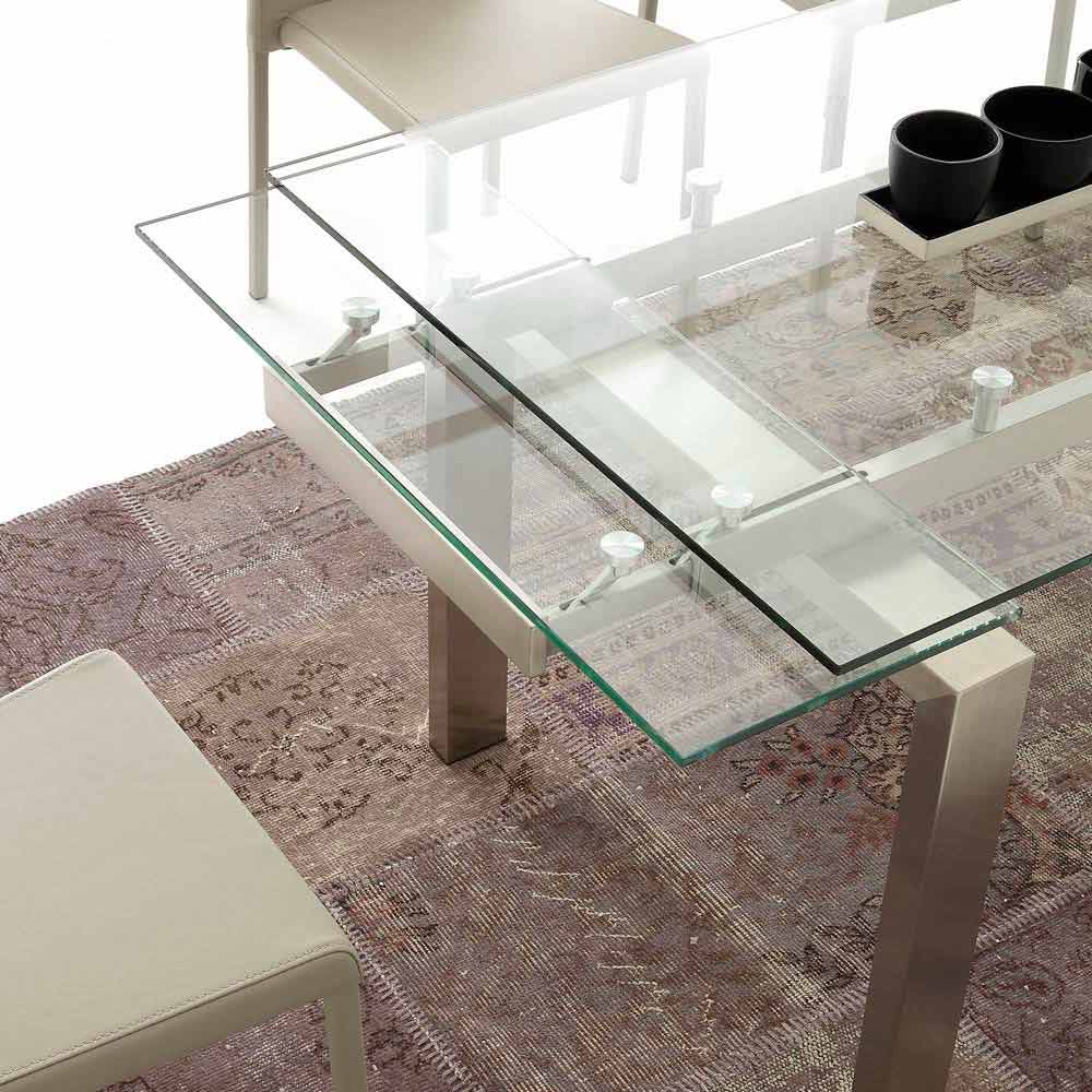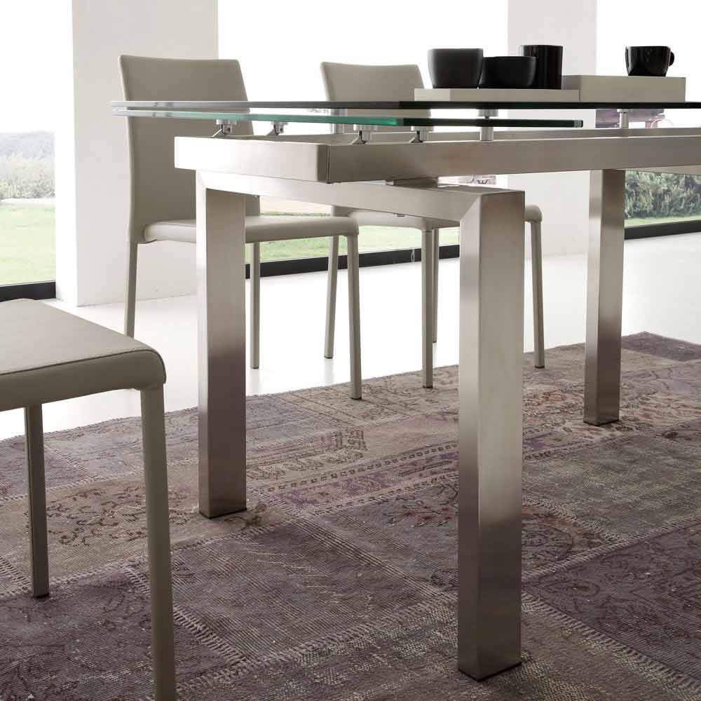 Nowoczesny stół jadalny z ramą ze szczotkowanej stali nierdzewnej i przezroczystym blatem z hartowanego szkła (10 mm).
