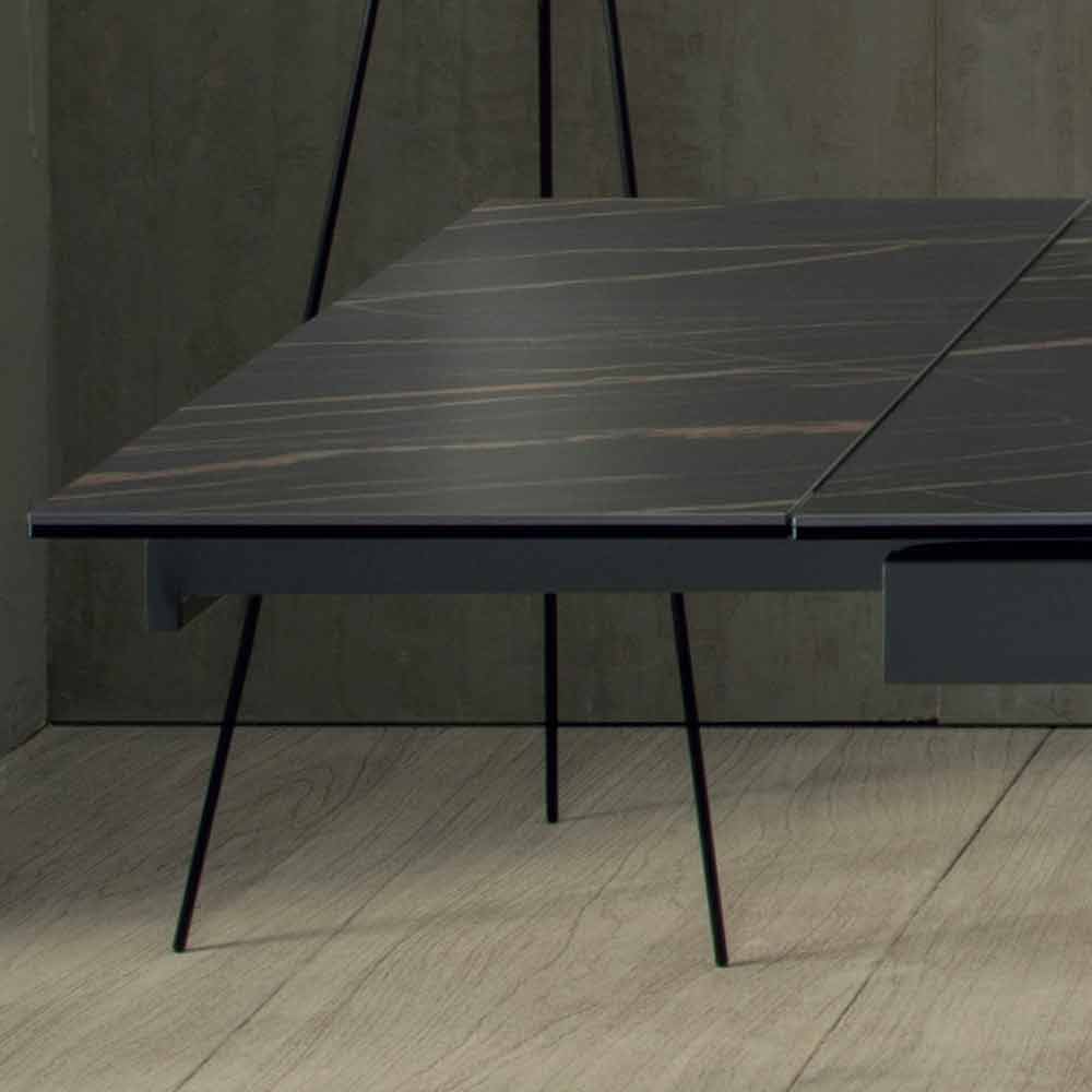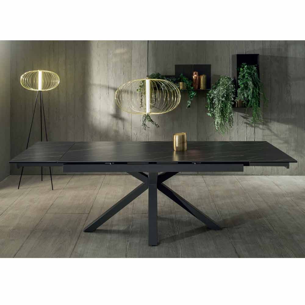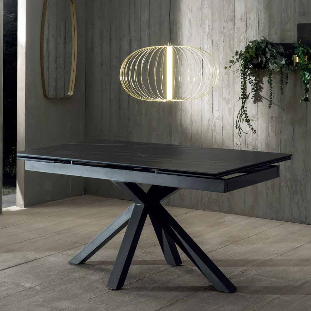 Rozkładany stół do jadalni z ceramicznym blatem i metalową podstawą.