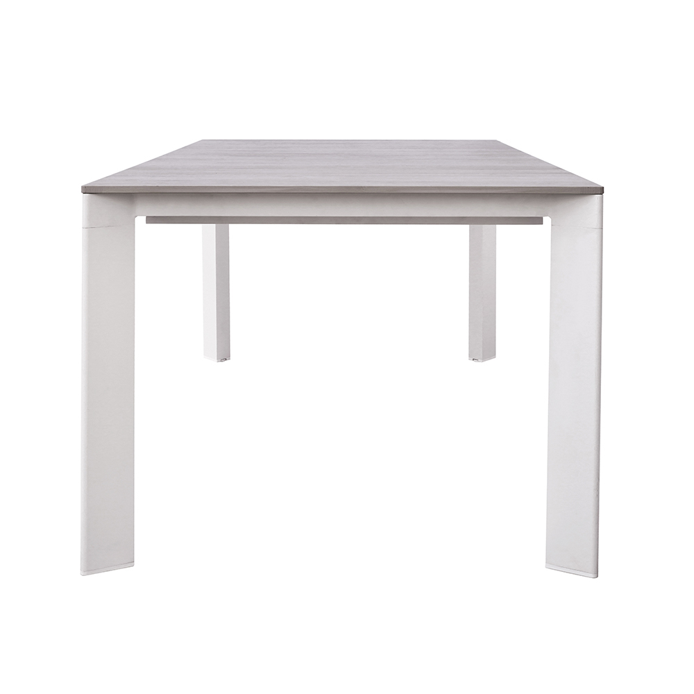Aluminiowy blat imitujący drewno łączy w sobie estetykę naturalnego drewna z trwałością aluminium, zapewniając elegancką, trwałą i łatwą w utrzymaniu powierzchnię. System rozkładania z wysuwanymi aluminiowymi nogami pozwala na łatwe i płynne rozkładanie stołu, zachowując jednocześnie maksymalną stabilność i harmonijny wygląd.
