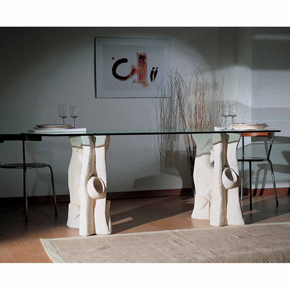 Nowoczesny stół wykonany we Włoszech, z centralną podstawą z naturalnego kamienia Vicenza,wyrzeźbione ręcznie z litego bloku, ze szklanym blatem o grubości 15 cm, przymocowane do podstawy za pomocą wyjmowanego stalowego kołnierza.