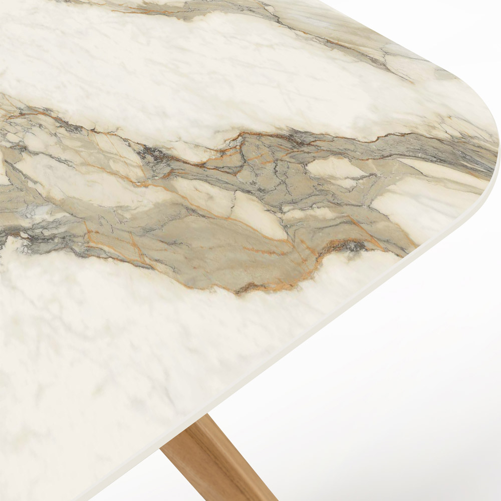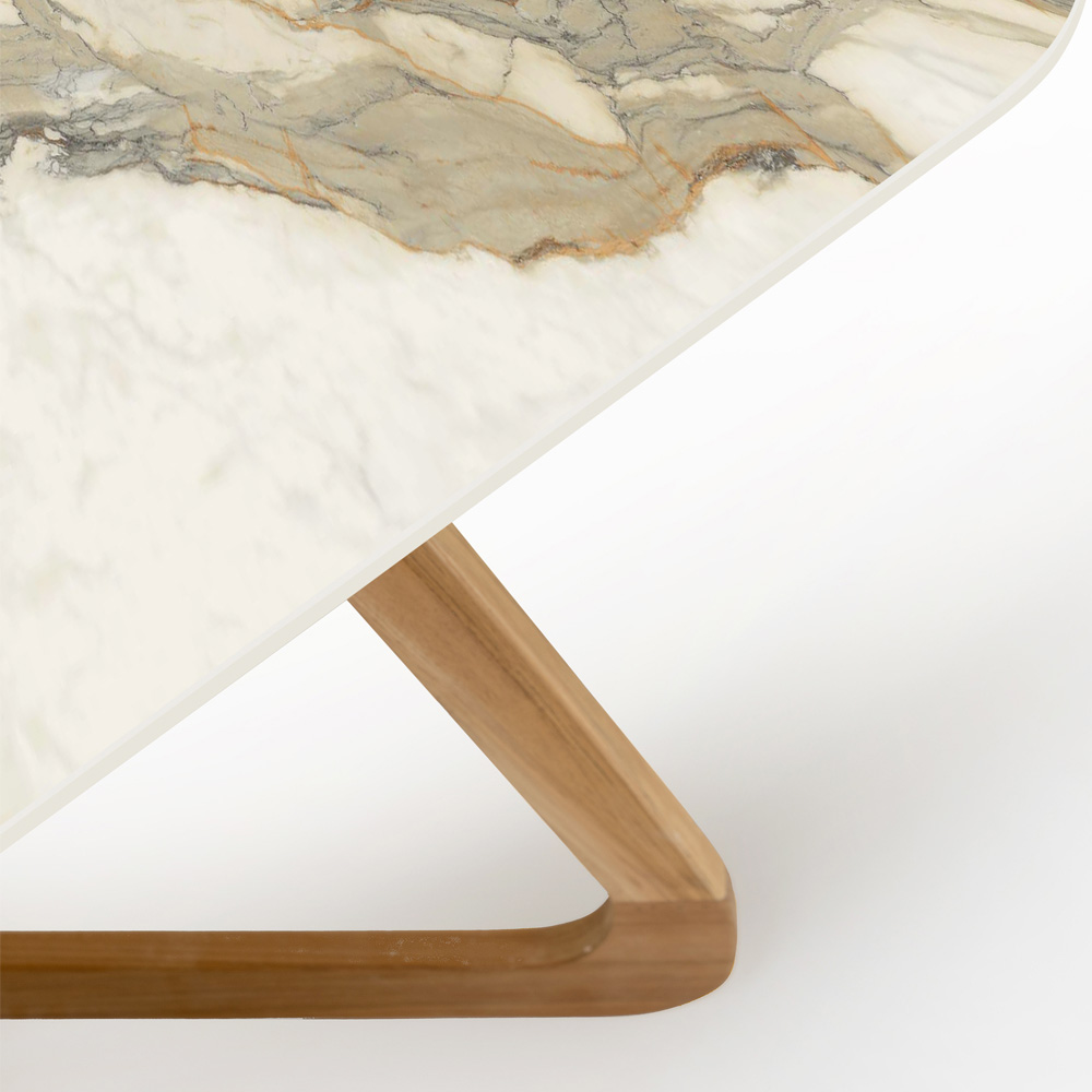 wyprodukowany we Włoszech. Ten stolik ogrodowy to arcydzieło designu, które łączy sztukę ceramiki z kunsztem obróbki drewna. Ceramiczny blat inspirowany jest prestiżowym marmurem Calacatta Hermitage , znanym z misternych szaro-zielonych żyłek na kremowo-białym tle, dodając odrobinę luksusu i wyrafinowania każdej przestrzeni ogrodowej.