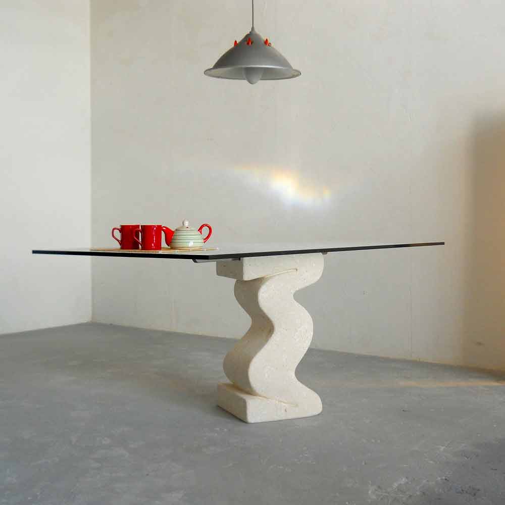 Nowoczesny stół wykonany we Włoszech, z centralną podstawą z naturalnego kamienia Vicenza,wyrzeźbione ręcznie z litego bloku, ze szklanym blatem o grubości 15 cm, przymocowane do podstawy za pomocą wyjmowanego stalowego kołnierza.