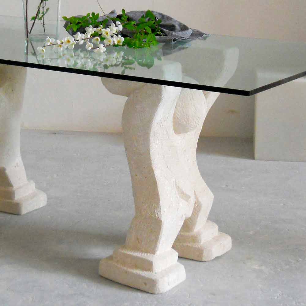 Nowoczesny stół wykonany we Włoszech, z centralną podstawą z naturalnego kamienia Vicenza,wyrzeźbione ręcznie z litego bloku, ze szklanym blatem o grubości 15 cm, przymocowane do podstawy za pomocą wyjmowanego stalowego kołnierza.