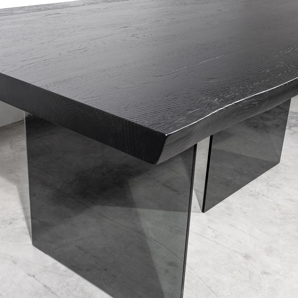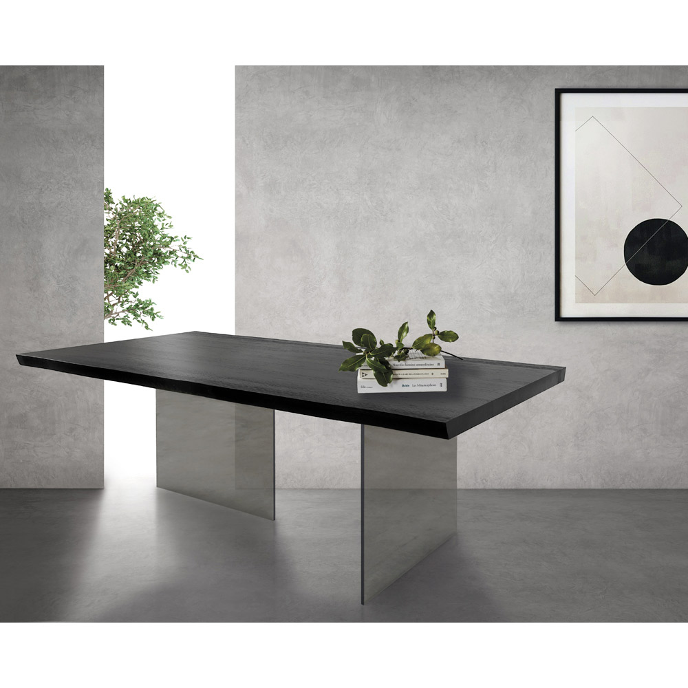 Drewniany stół pokryty sękatym dębem i kryształową podstawą Made in Italy.