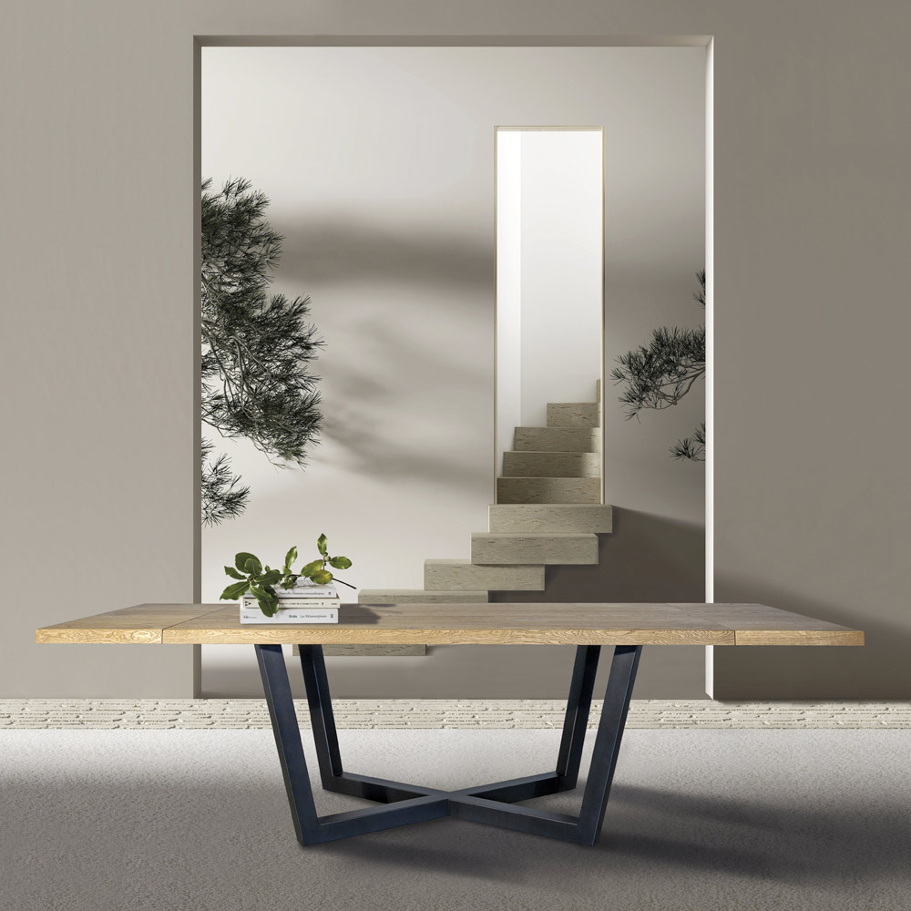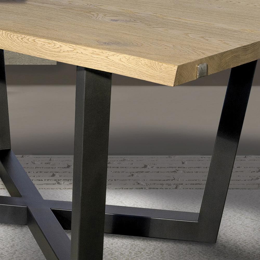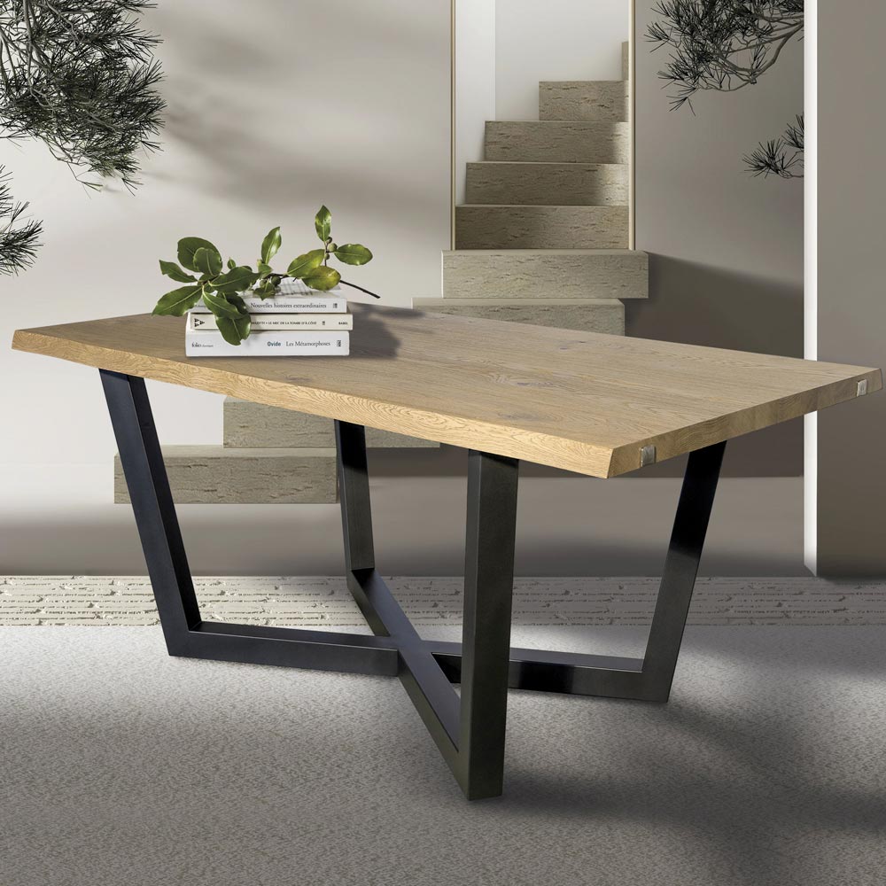 Stół z sękatego dębu i metalowej podstawy Made in Italy.
