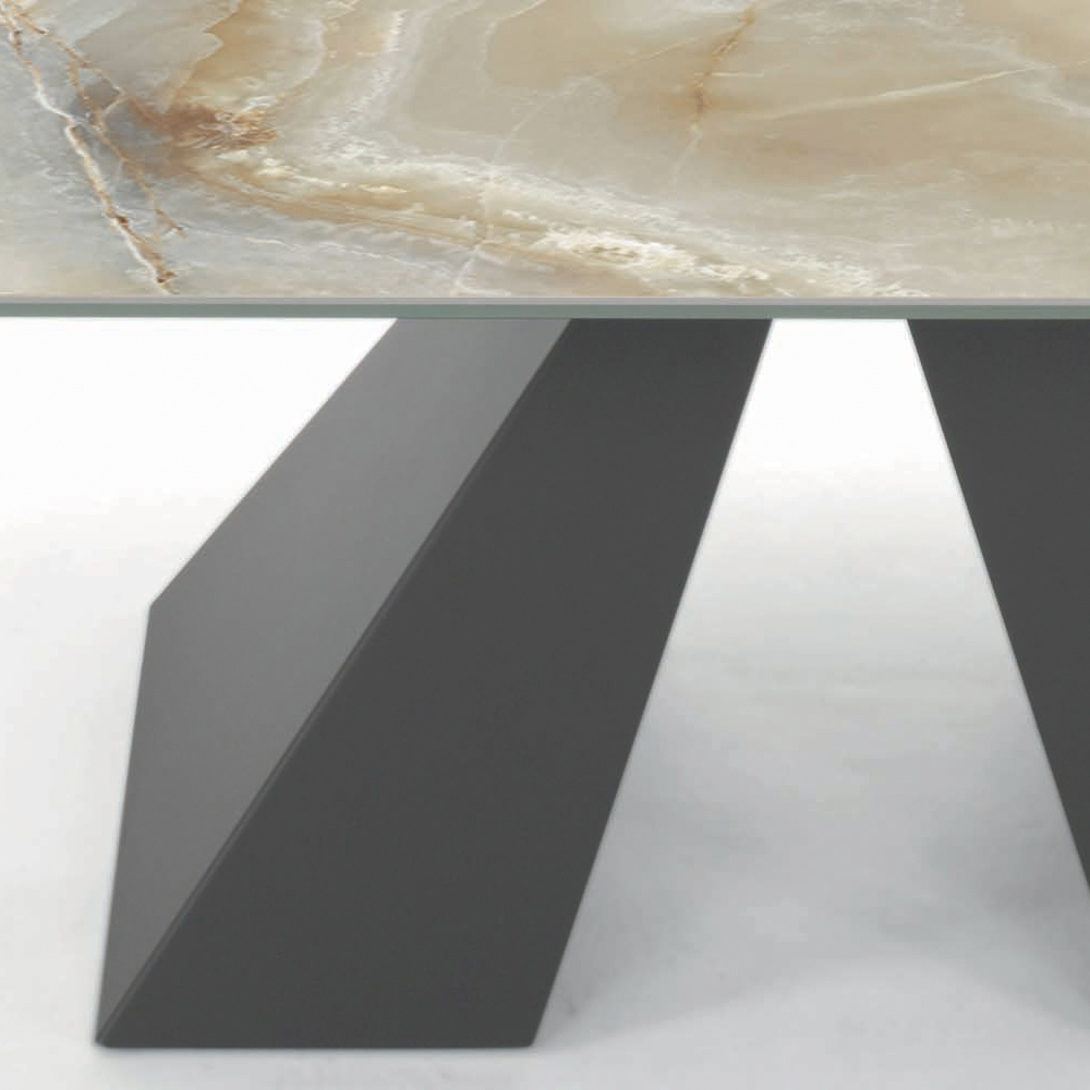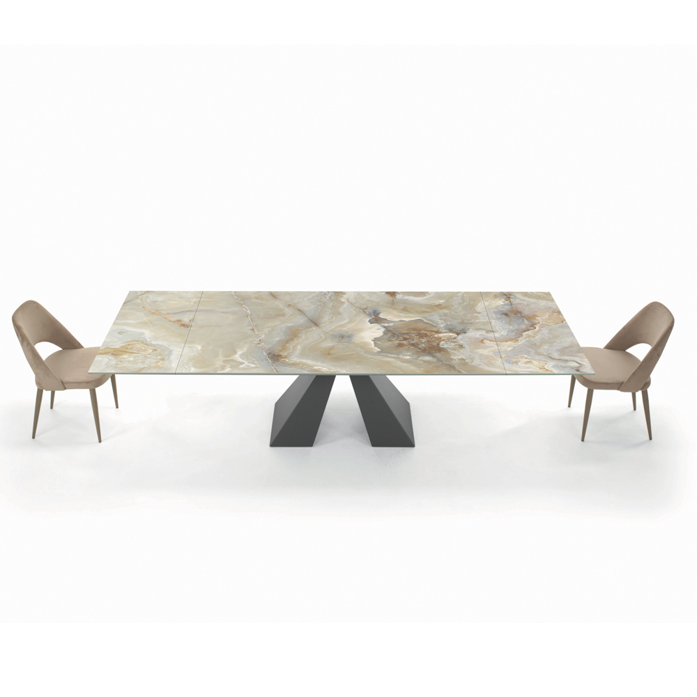 Rozkładany stół do salonu ze zintegrowanymi przedłużeniami, ceramicznym blatem w błyszczącym złotym wykończeniu onyksu , prostą krawędzią, podstawą ze