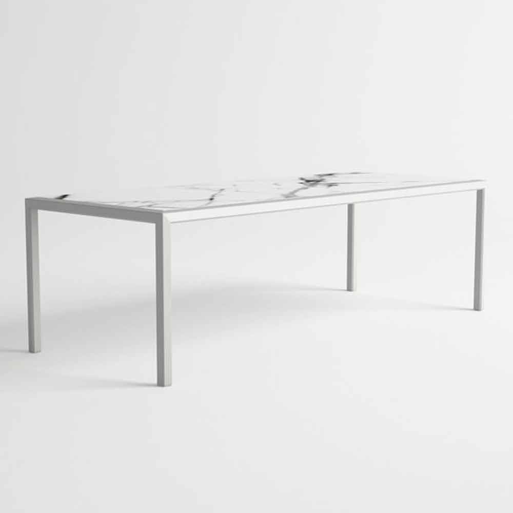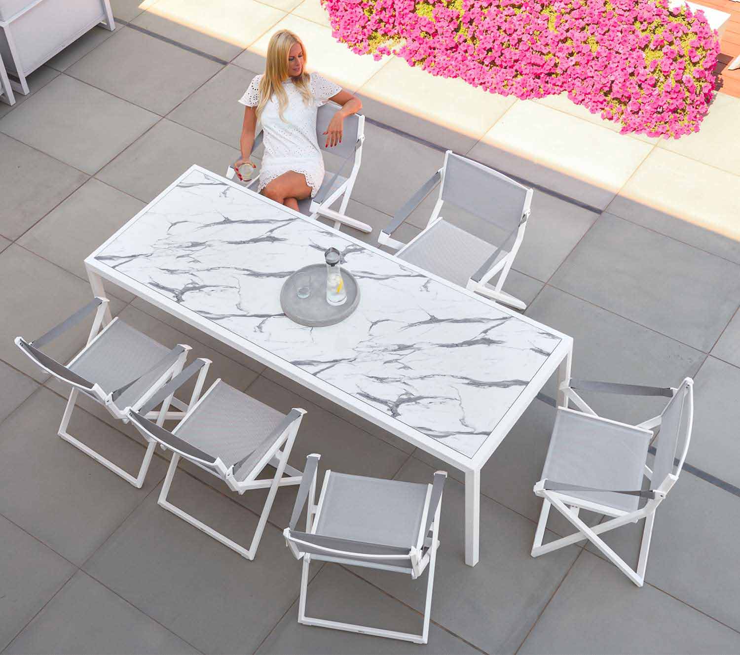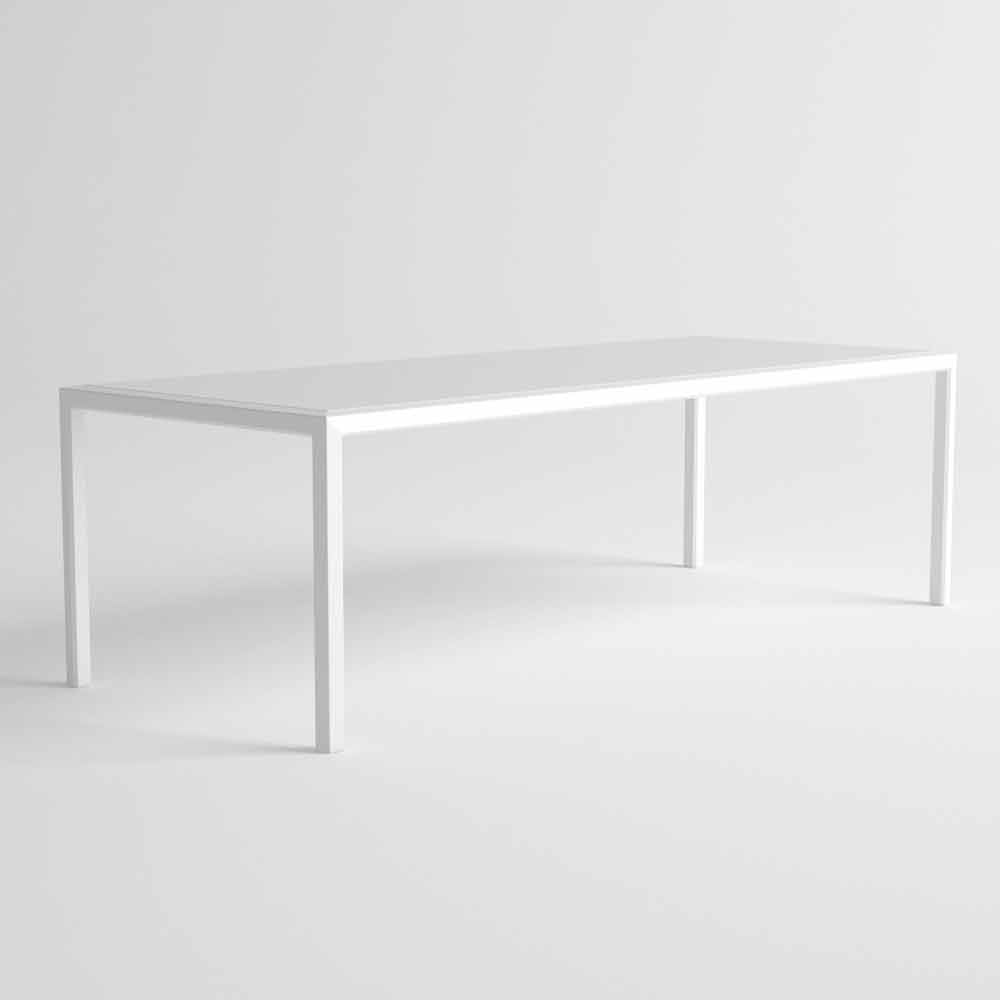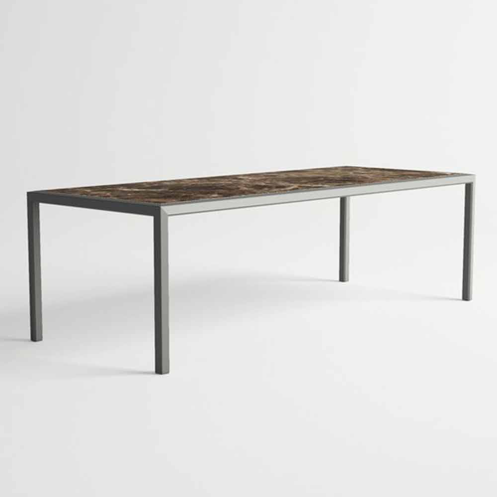 Nowoczesny stół zewnętrzny, aluminiowa konstrukcja i laminowany blat HPL.