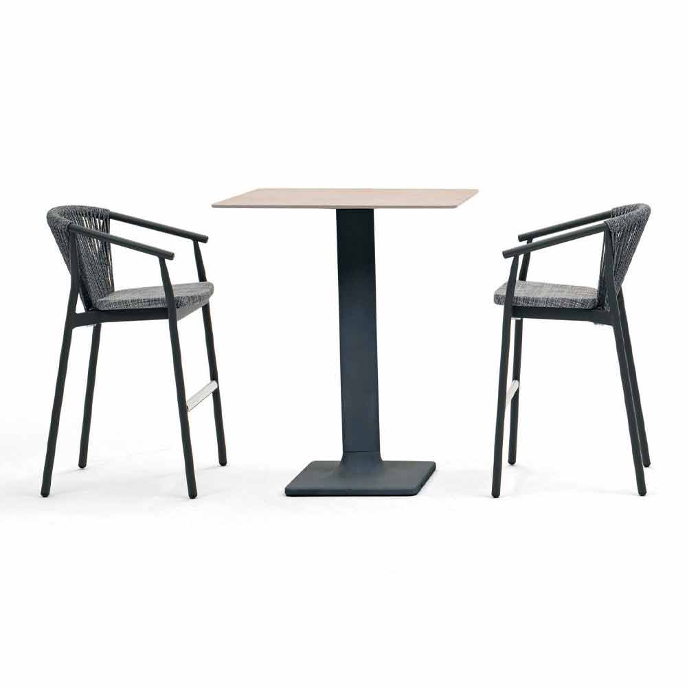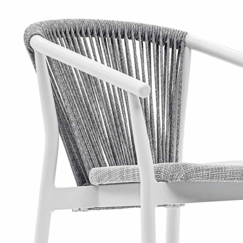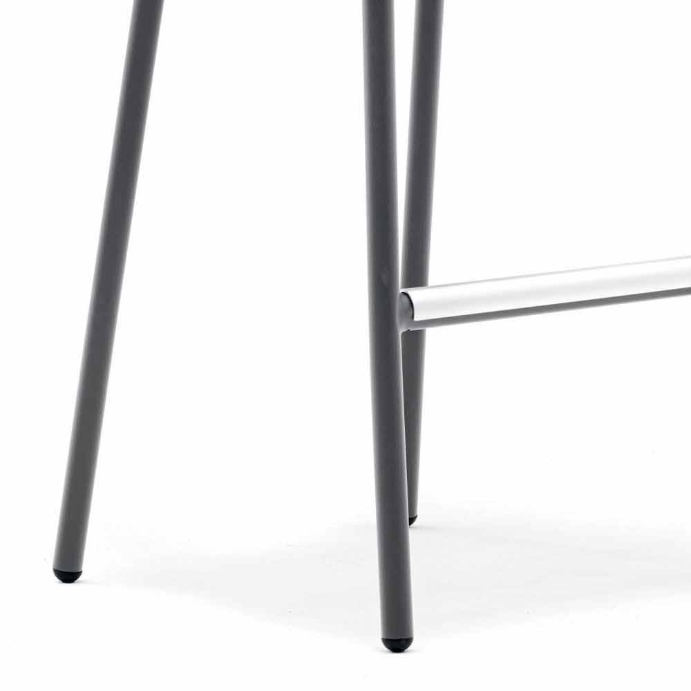Stołek zewnętrzny o nowoczesnym designie z aluminiową podstawą i siedziskiem z tkaniny technicznej w kolorze białym lub jesionowym.